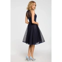Večerní šaty ke kolenům se síťovaným sedlem a sukní. Šité detaily a zavazování na zádech s klíčovou dírkou.