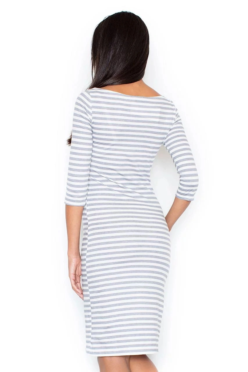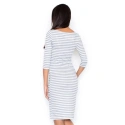 Módní pruhované dámské šaty jsou jednoduchého střihu a 3/4 rukávy. Mají délku pod kolena a kulatým výstřih. Vhodné na jaro a léto.