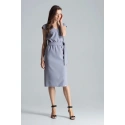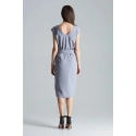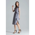 Šedé midi šaty s véčkovým výstřihem a elastickým páskem v pase. Přídavný látkový pásek. Asymetrický rozparek na levé nohavici, bez podšívky.