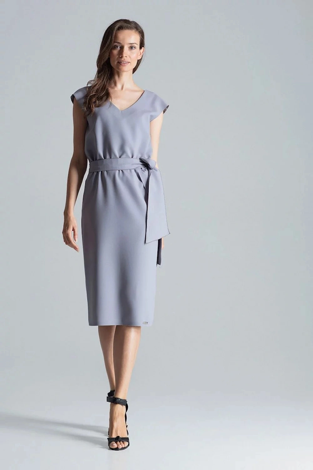 Šedé midi šaty s véčkovým výstřihem a elastickým páskem v pase. Přídavný látkový pásek. Asymetrický rozparek na levé nohavici, bez podšívky.