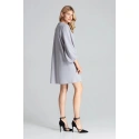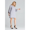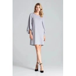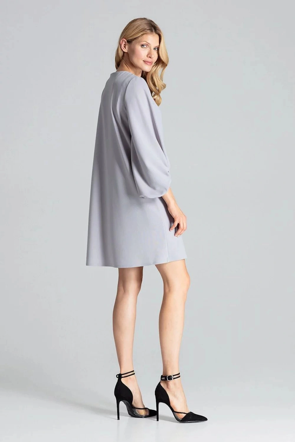 Šedé trapézové midi šaty s dlouhými bufetovými rukávy zakončenými řasením, bez podšívky, bez kapes. Půlkulatý výstřih.