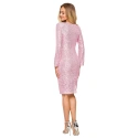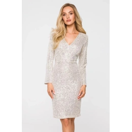 Zvýrazněný pas, boky a výstřih, dlouhé rukávy a lesklá flitrová látka jsou zárukou dokonalého večerního vzhledu. Šaty se zapínají na krytý zip a mají podšívku.