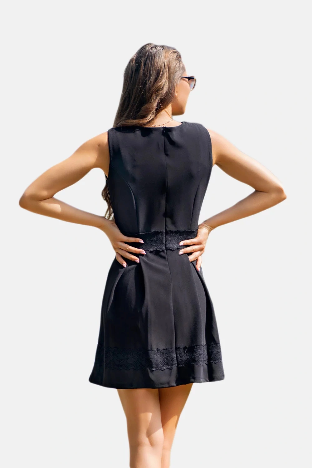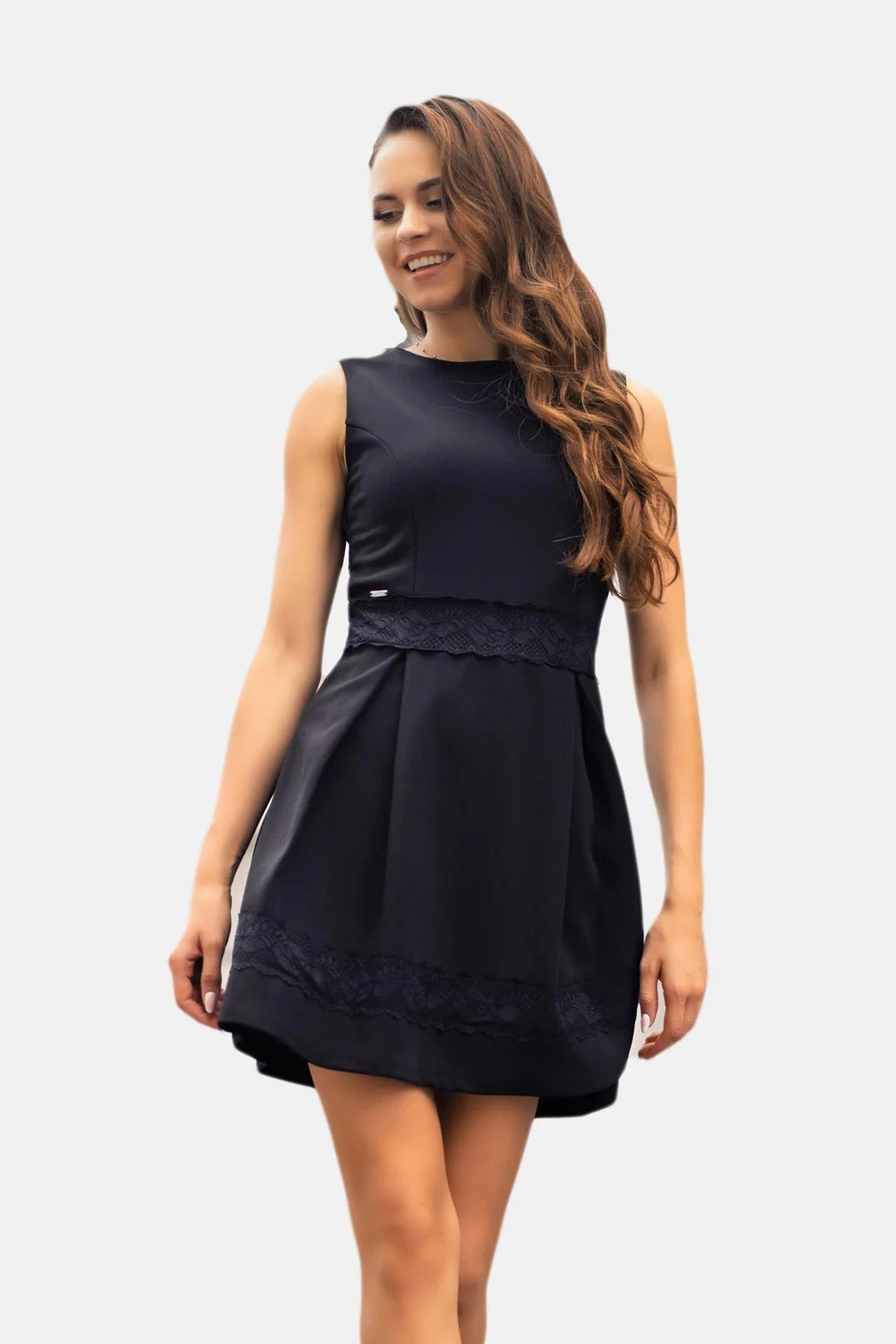 Dámské šaty bez rukávů, s krajkovým všitým pasem a krajkou u spodní části sukně. Sukně je rozšiřená. Zapínání šatů je vzadu na skrytý zip.