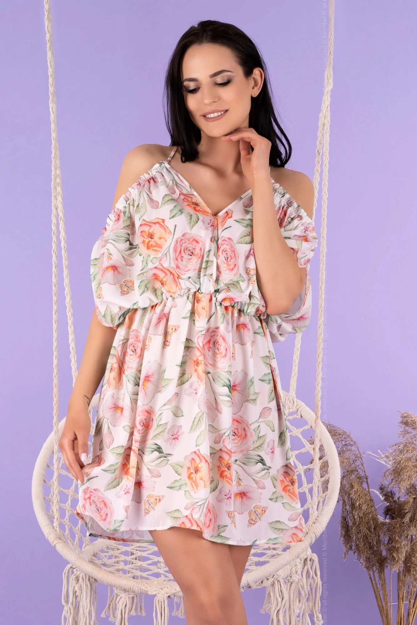 Mini šaty s květinovým vzorem, lodičkovým výstřihem a krátkými rukávy. Bavlna 100 % Velikost C