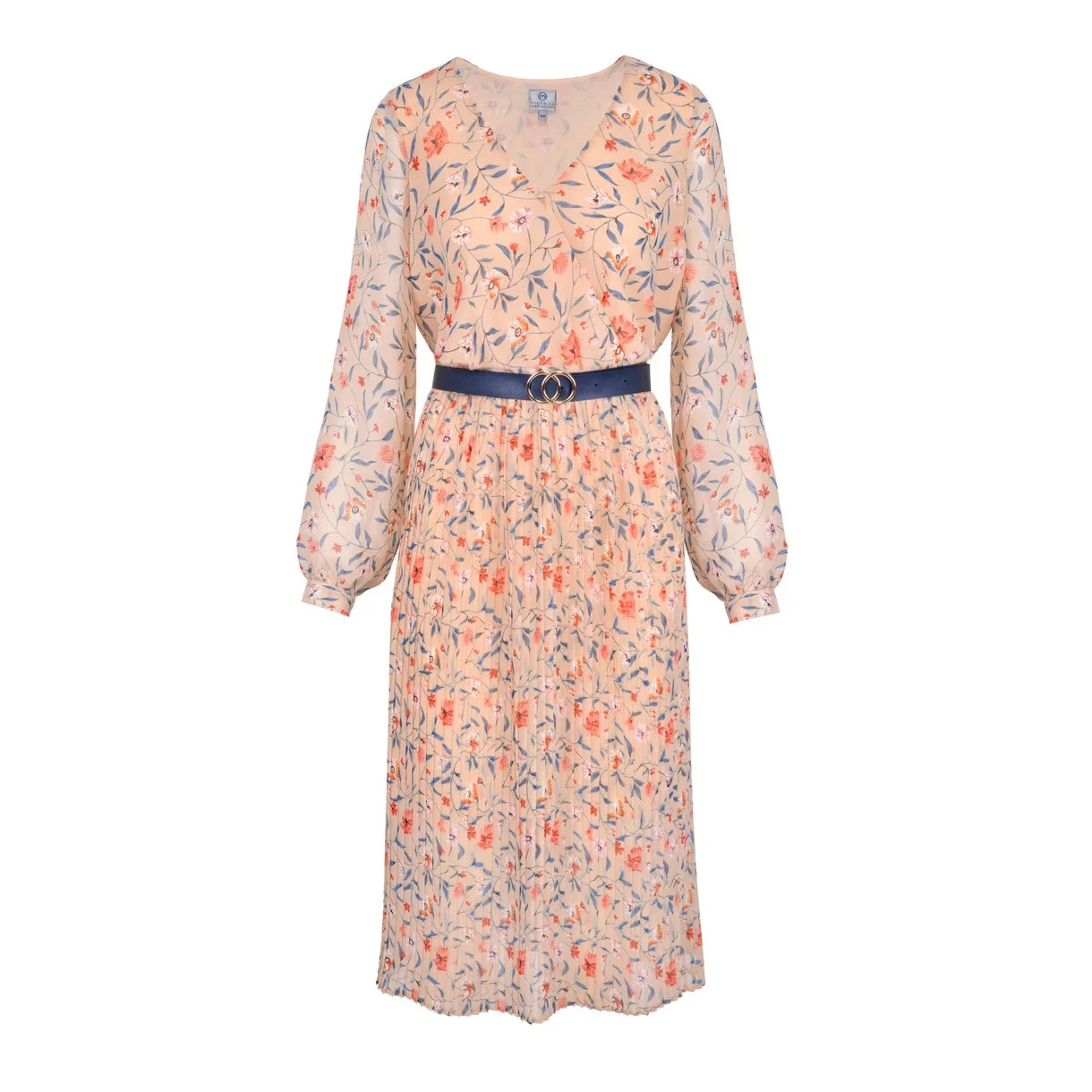 Dlouhé plisované květinové šaty s dlouhými rukávy a nabíranou plisovanou sukní.