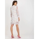 Rozměry šatů ve velikosti 36 měřené na plocho: šířka v podpaží - 46 cm, délka rukávu - 58 cm, celková délka - 85 cm.Světle šedé šaty s květinovým potiskem.