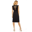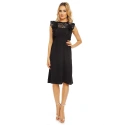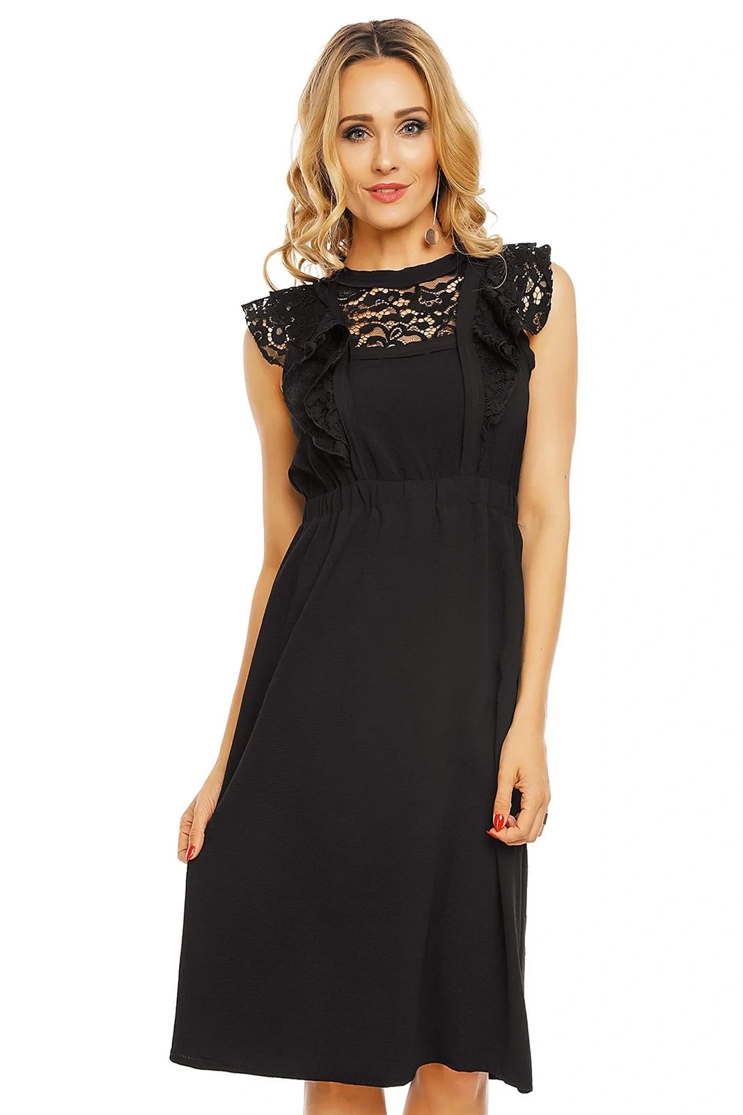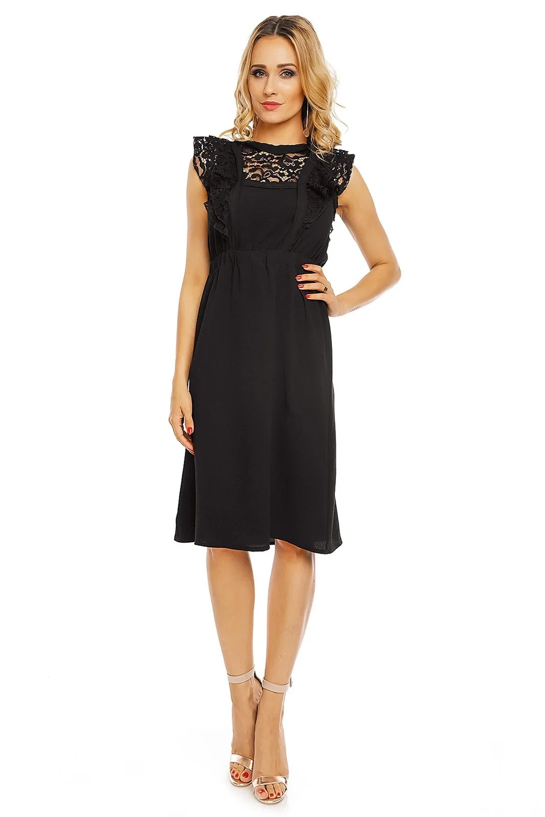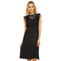 Jednoduché dámské šaty, které jsou doplněny krajkou. Tento model má velmi krátké rukávky, které zakrývají spíše jen ramena. Rukávky jsou tvořeny krajkou ze dvou vrstev. Krajka sahá téměř po pás a to v přední, ale i zadní části tohoto modelu. Šaty jsou bez výstřihu. Je lehce odhalen pouze dekolt, který je zakrytý stejnou krajkou. V pase je guma, která je velmi elastická. Následuje delší hladká sukně, která sahá pod kolena. Zapínání u tohoto modelu je řešeno pouze knoflíkem za krkem, jinak jsou záda lehce odhalená. Oblečte si tyto šaty na společenskou událost, večírek nebo posezení s přáteli.