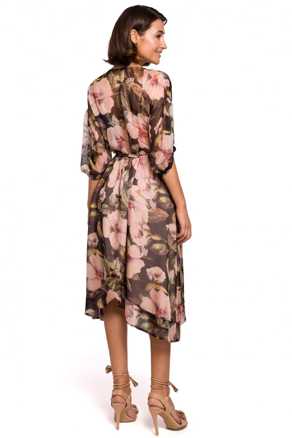 Elegantní dámské květované šaty s krátkým rukávem a překládaným výstřihem do V. Šaty jsou vyrobené z