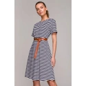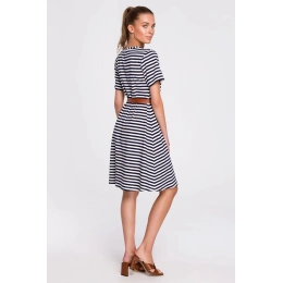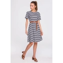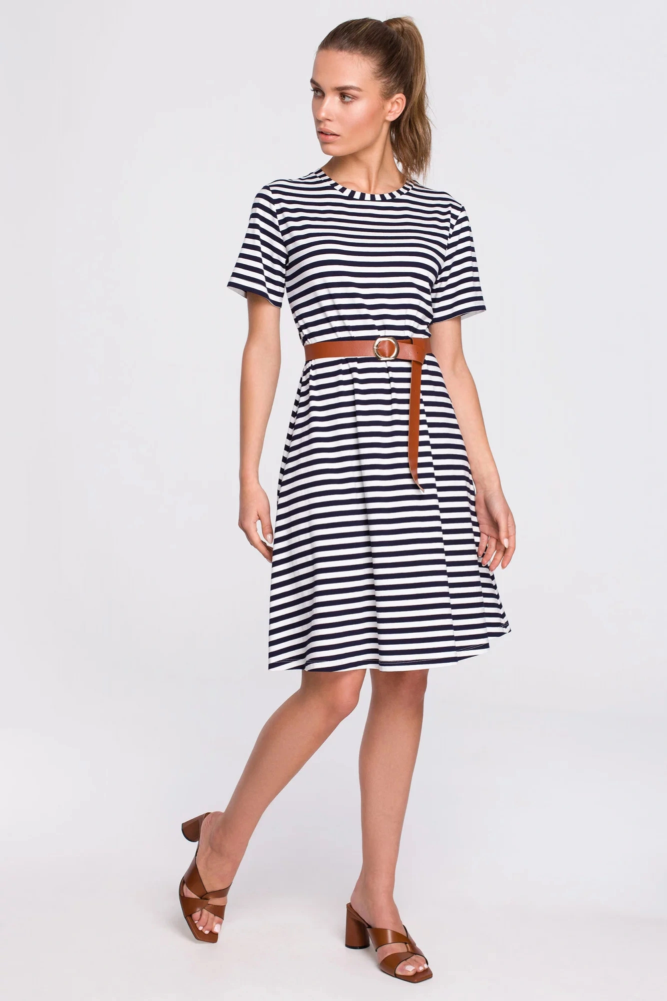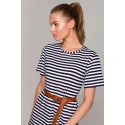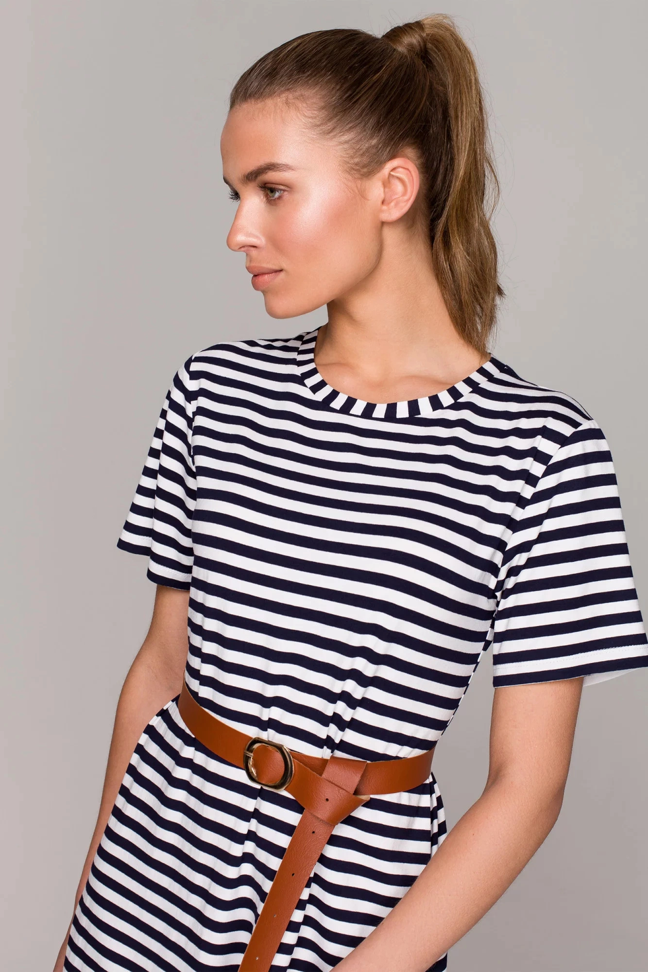 Pruhované viskózové žerzeje. Šaty áčkového střihu. Délka nad kolena. Součástí balení je pásek s přezkou. Naše modelka je vysoká 174 cm a nosí velikost S.