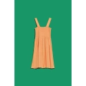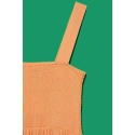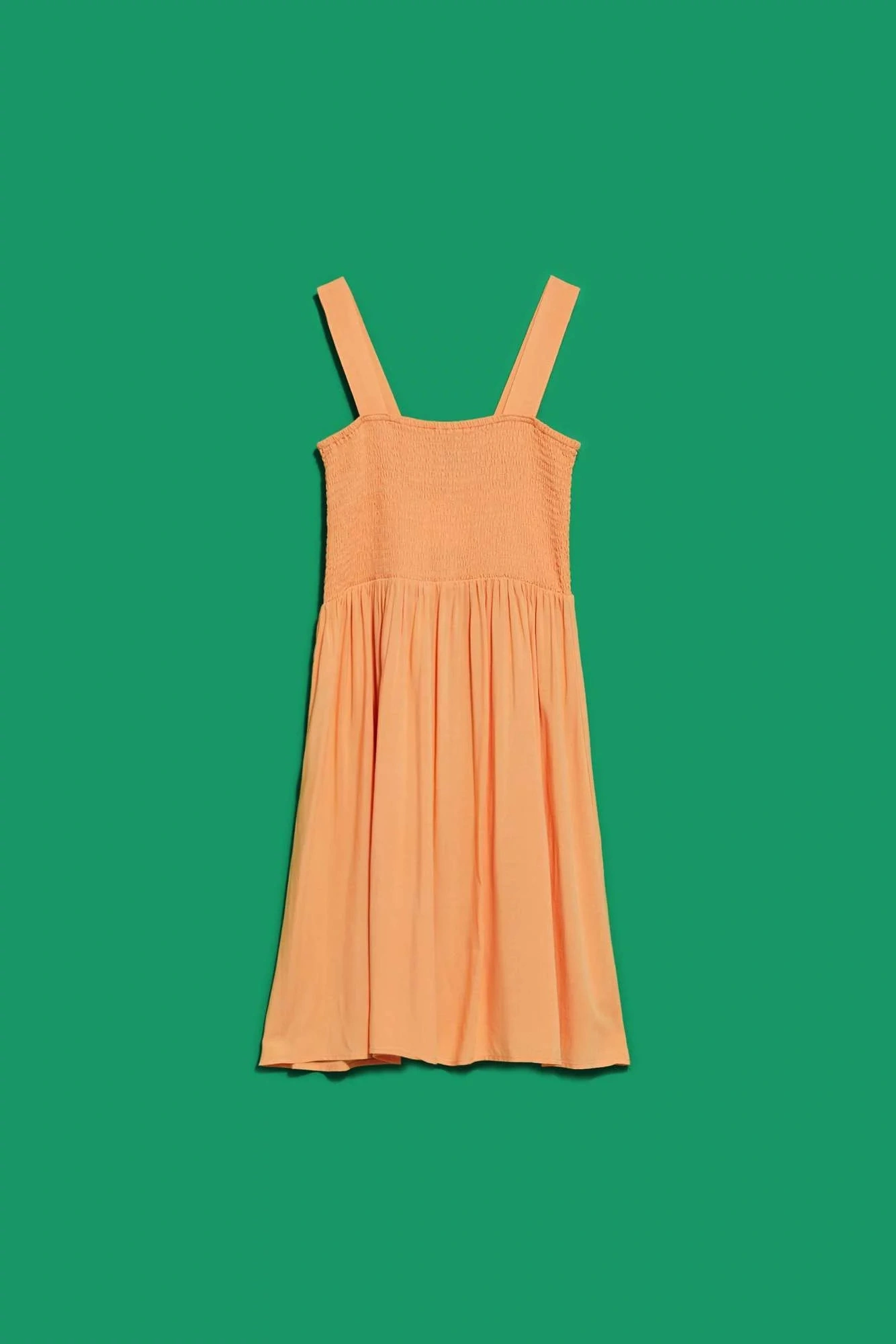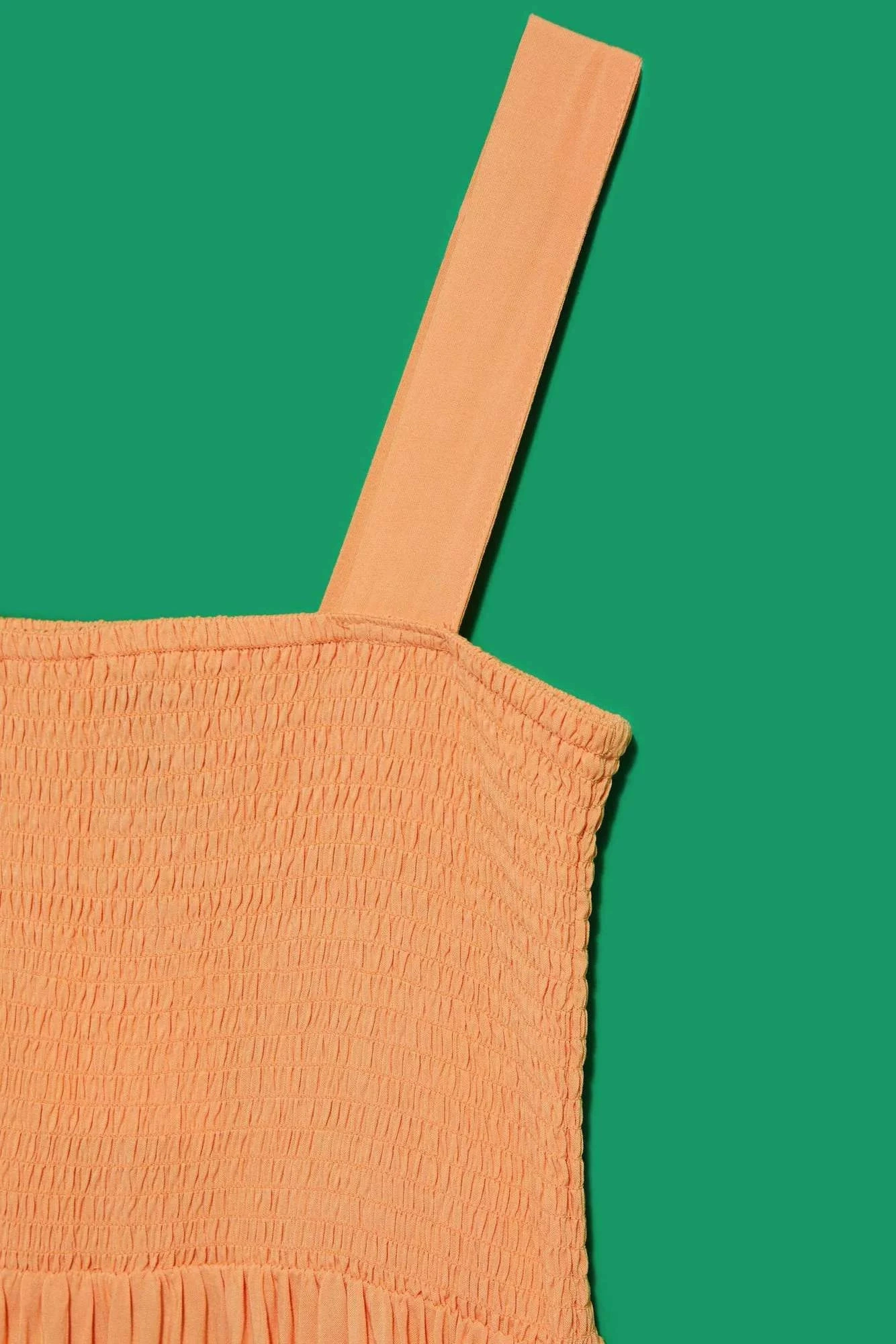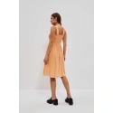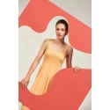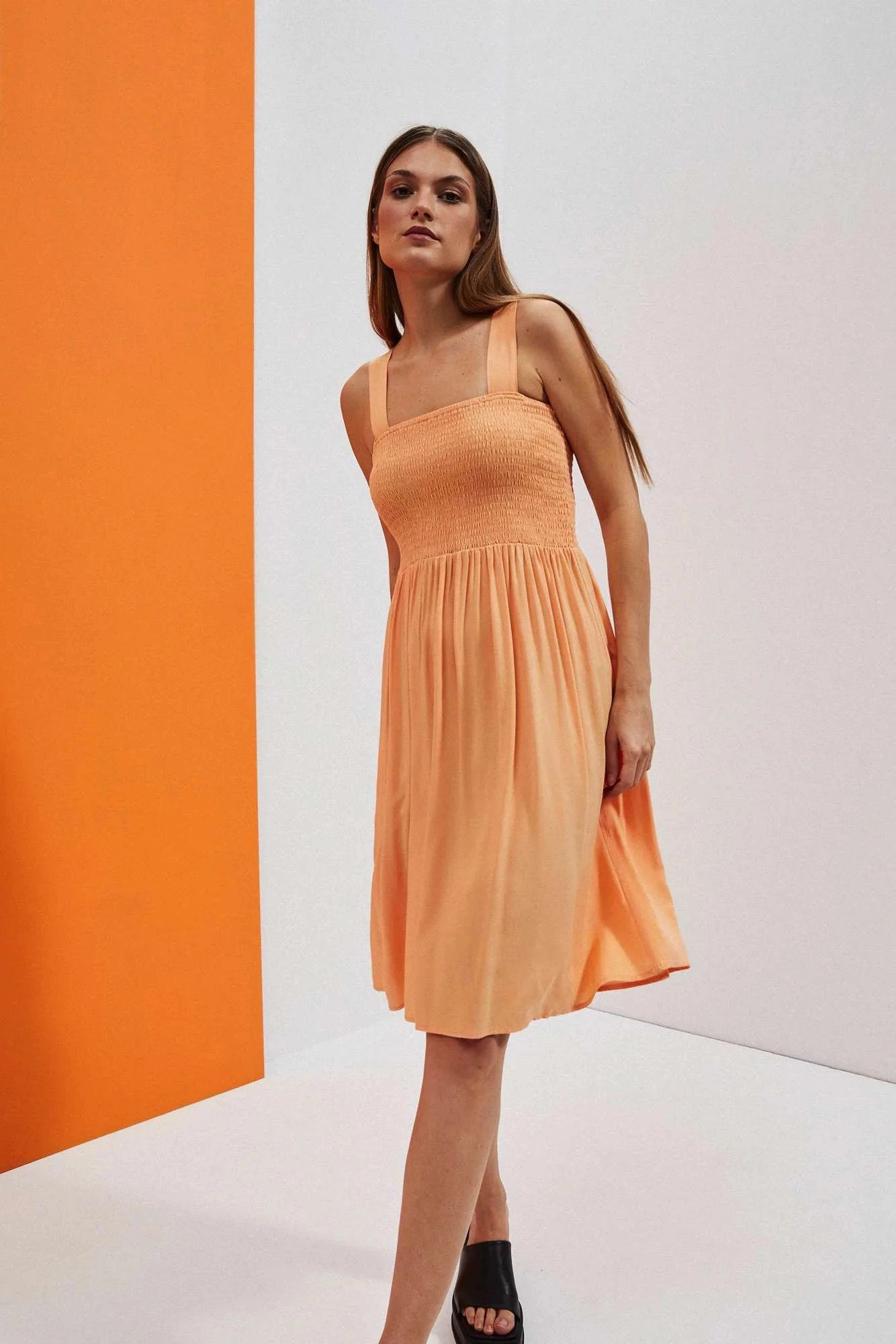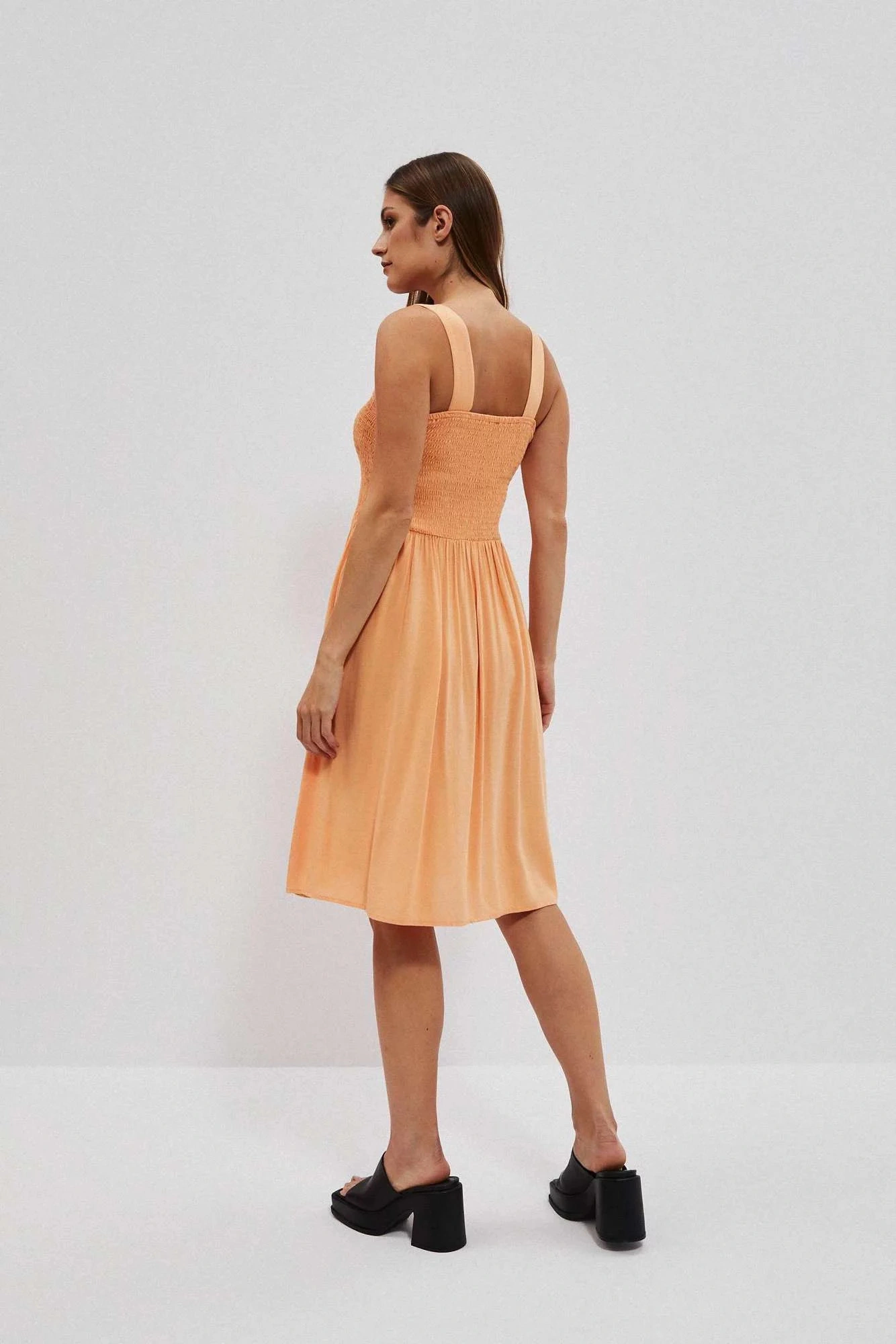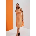 Extrémně ženské šaty, s otevřenými rameny, širokými ramínky. Oranžová barva. Hladké, bez vzorů. Horní část šatů je ve formě stahovací šňůrky. Dokonale se přizpůsobí postavě a zdůrazní ženské tvary. Spodní díl šatů je volný, volný a rozšířený. Délka nad kolena. Vyrobeno z příjemné na dotek a vzdušné viskózy. Ideální na pláž a každodenní styling. Ideální na léto, to musíte mít!