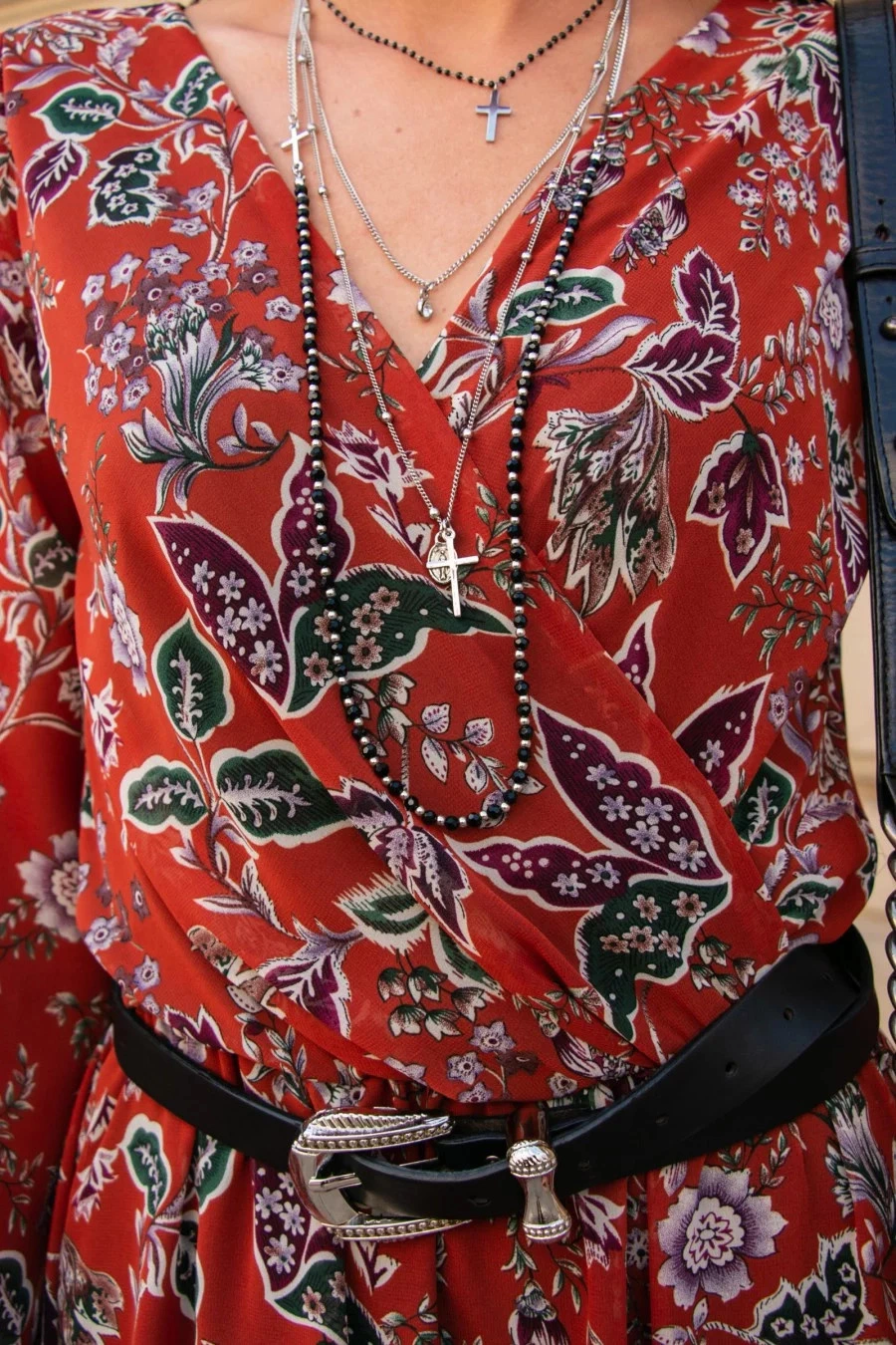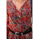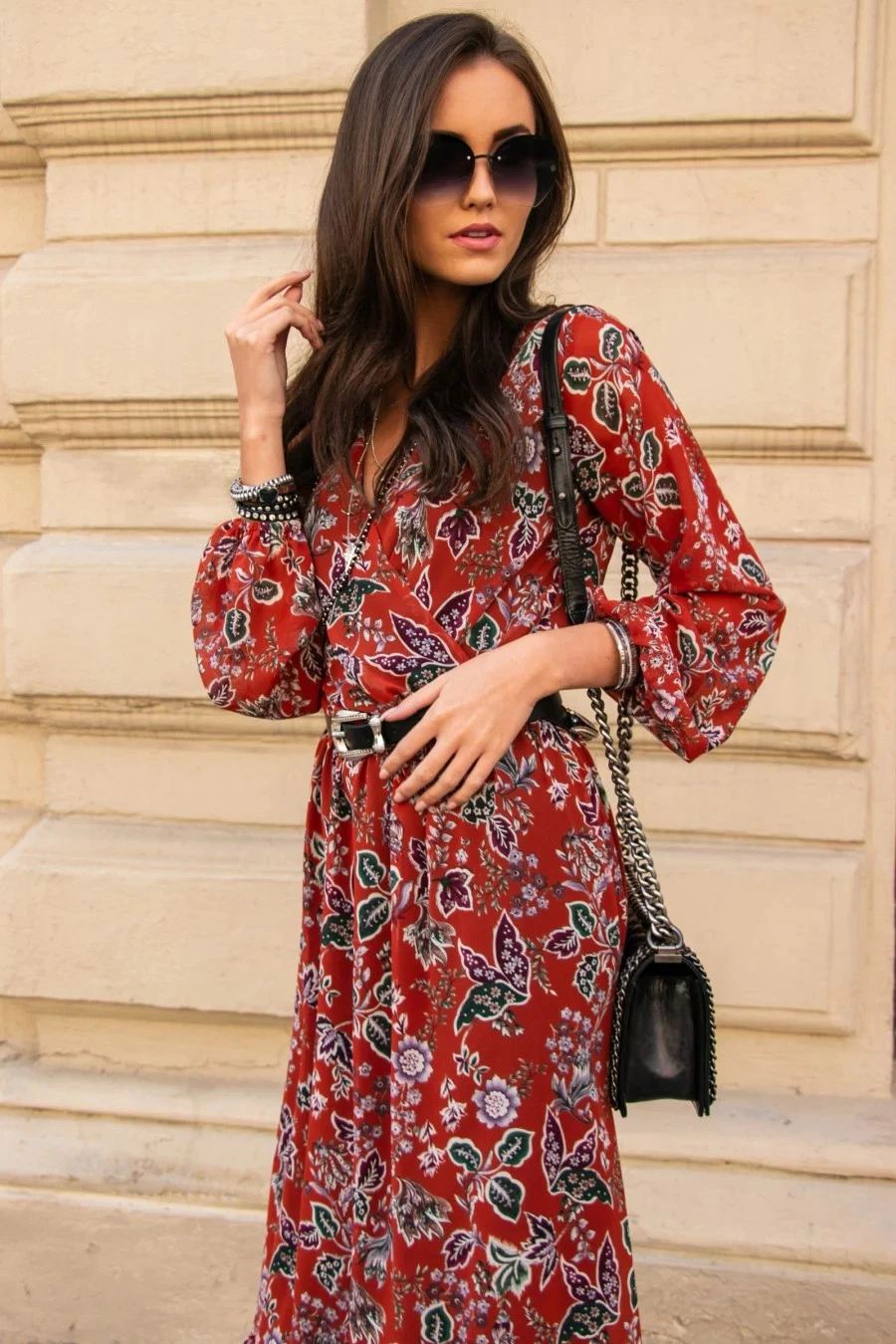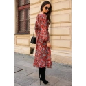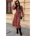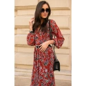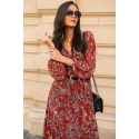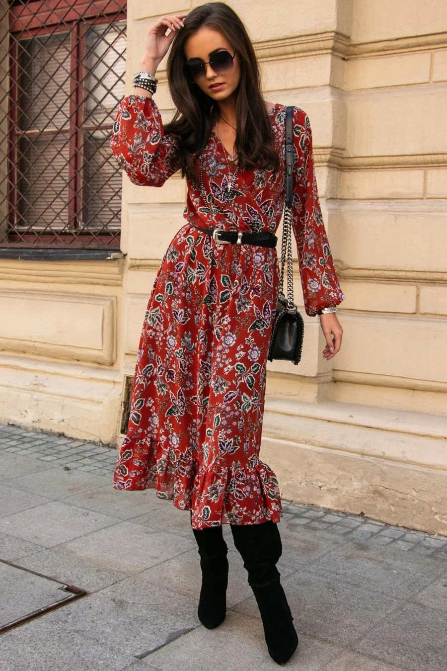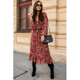 Šaty v délce midi s módním vzorem, zavinovacím výstřihem, nařasenou spodní částí, pružným pasem a podšívkovanou sukní. Vyrobeno v Polsku. Modelka je vysoká 174 cm a nosí velikost 34.