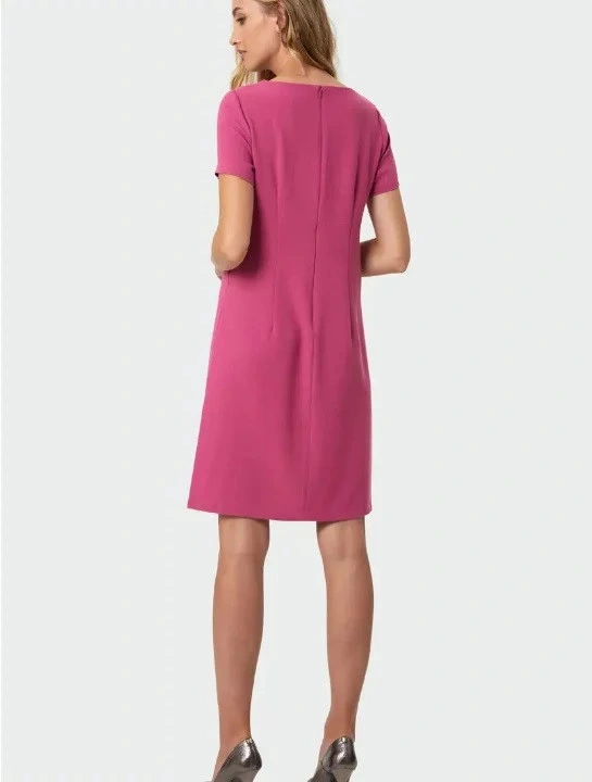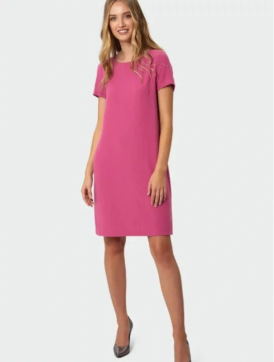 Dámské šaty ke kolenům, jednoduchého střihu, s krátkým rukávem, u krku kulatý výstřih.