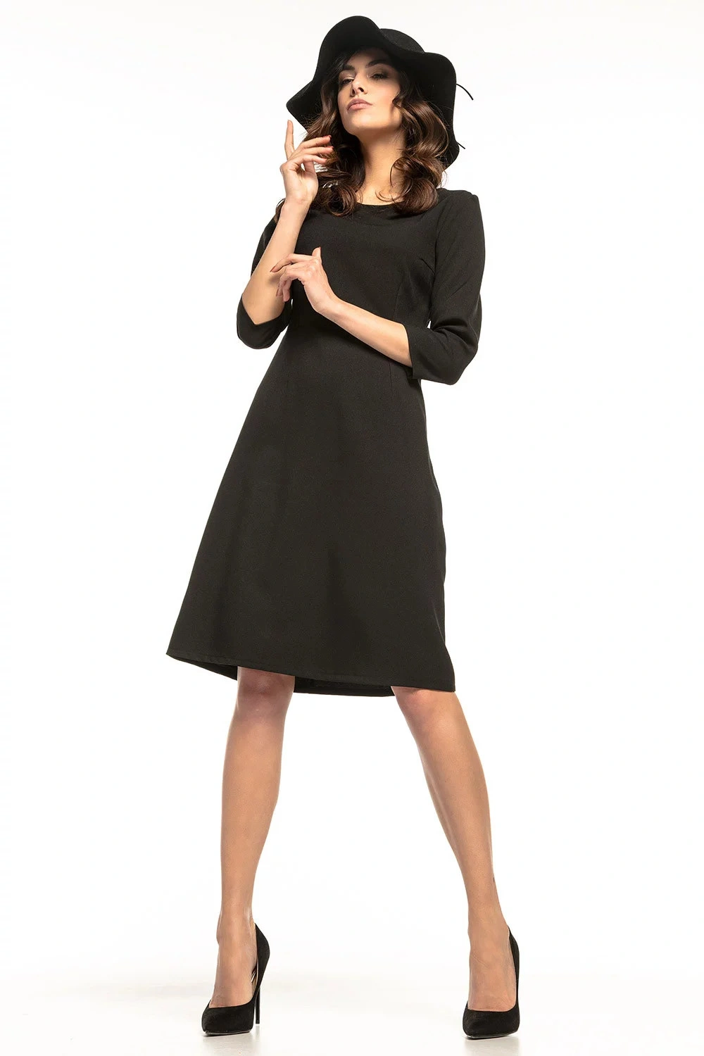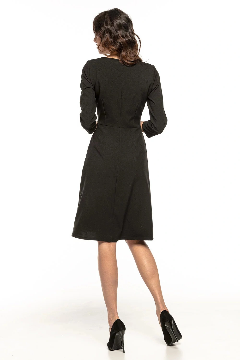 Elegantní šaty střižené na postavu s 3/4 rukávy. Knoflíky našité na přední straně v asymetrické lini