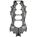 Černé romantické body V-9490 je kombinací klasické černé a jemných, ale zajímavých béžových průstřihů. Krajkové zdobení vám umožní vychutnat si pohled na hladkou pokožku, zatímco ženský vzor a neobvyklé průstřihy na zádech podtrhují svůdnost tohoto modelu. Model se zapíná u krku a v rozkroku, bez drátků s nastavitelnými popruhy.
