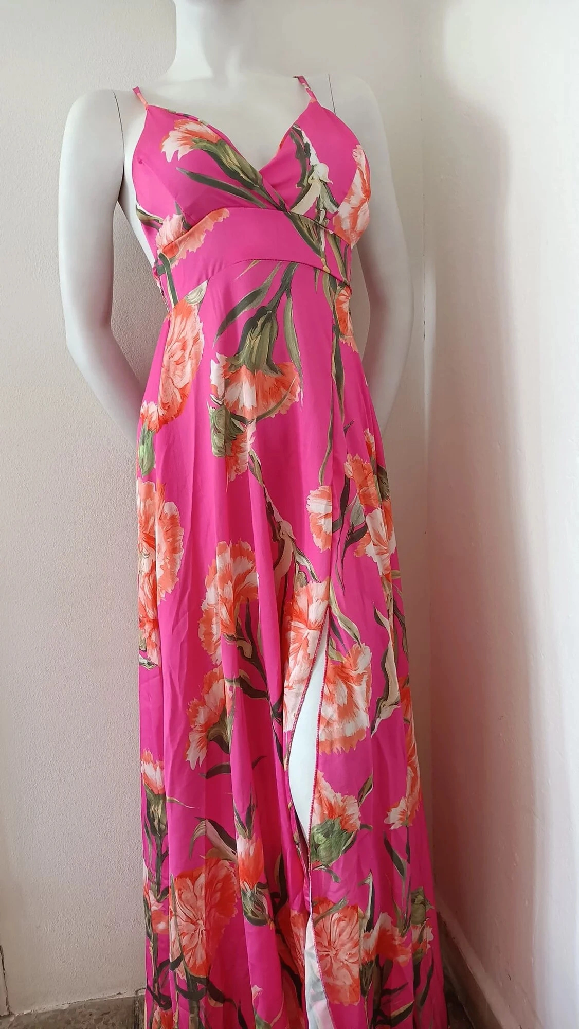 Dámské letní dlouhé šaty, s rozparkem. Na poprsí vyztužené, bez kostic. 100% polyester / s košíčky