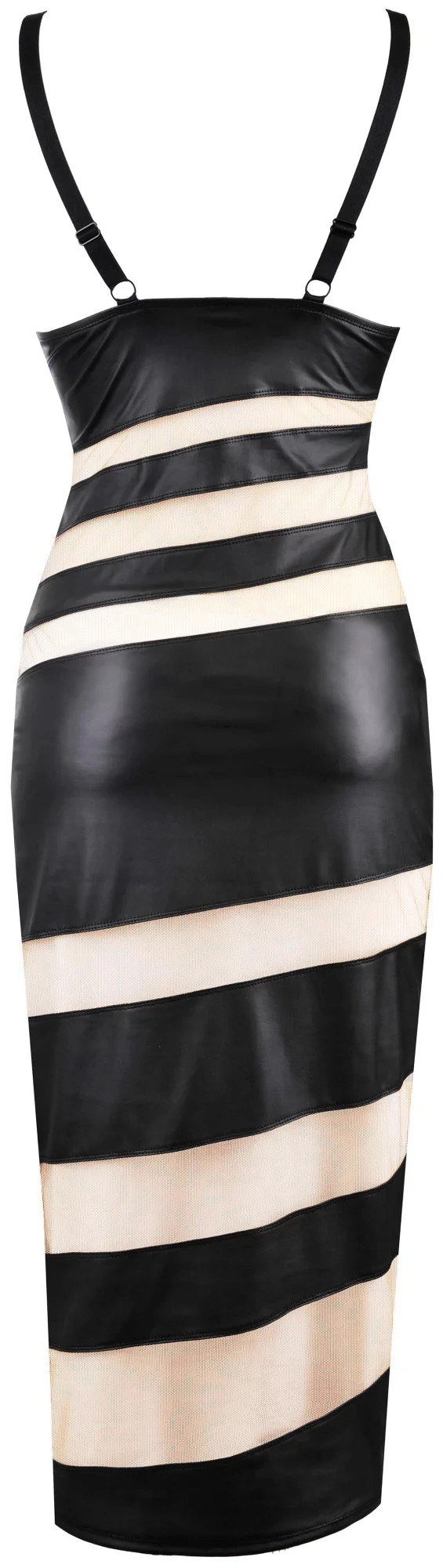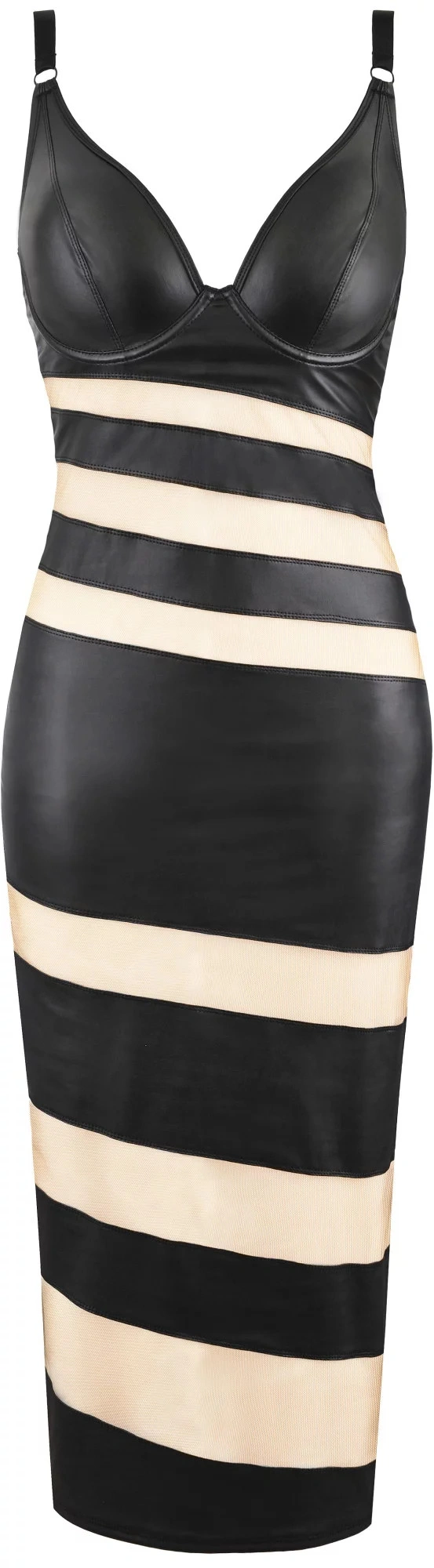 Díky svůdné kombinaci tkaniny wetlook a průsvitných vsadek z vás nebude možné spustit oči. Měkké košíčky s drátky se dokonale přizpůsobí vašim ňadrům, nadzvednou je a poskytnou vám volnost pohybu při tanci. Nastavitelná ramínka zajistí ještě lepší přizpůsobení. Šaty se nasazují přes hlavu.
