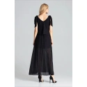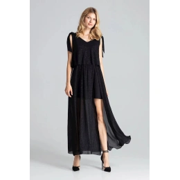Černé dlouhé smyslné šaty bez rukávů, zavazované na ramenou, s velkým hlubokým výstřihem. Horní část šatů je zdobená vzdušnou látkou. V pase je pružný pásek a na levé straně je v pase rozparek. Pod nimi částečně vypasované šaty s mírně rozšířeným spodním okrajem před koleny.