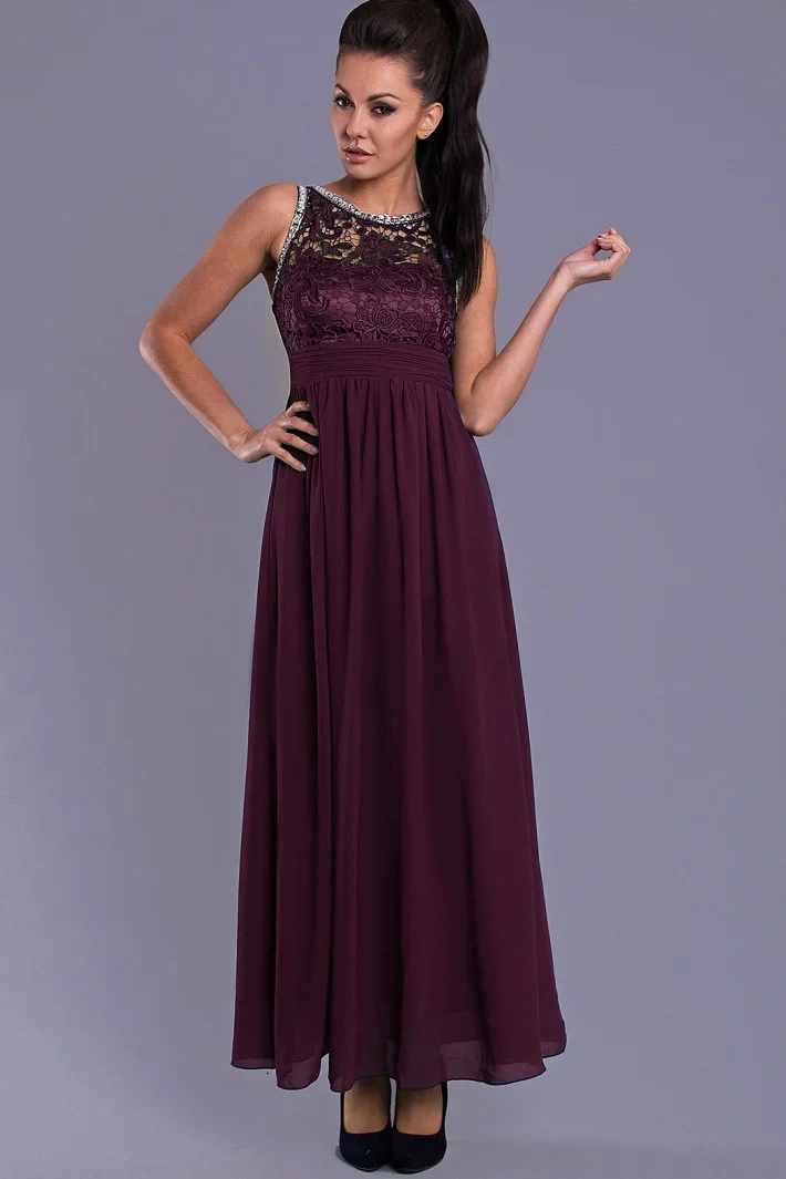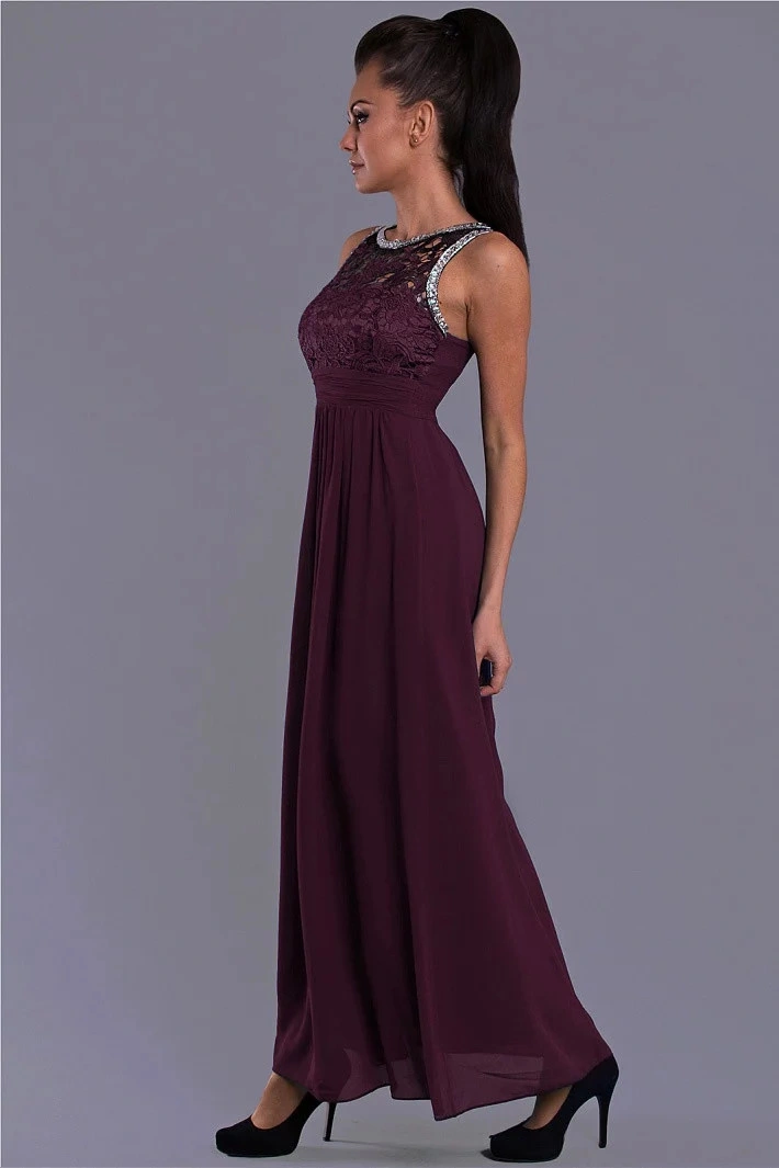 Dámské společenské šaty EVA LOLA s krajkou a kamínky dlouhé vínové