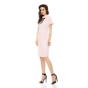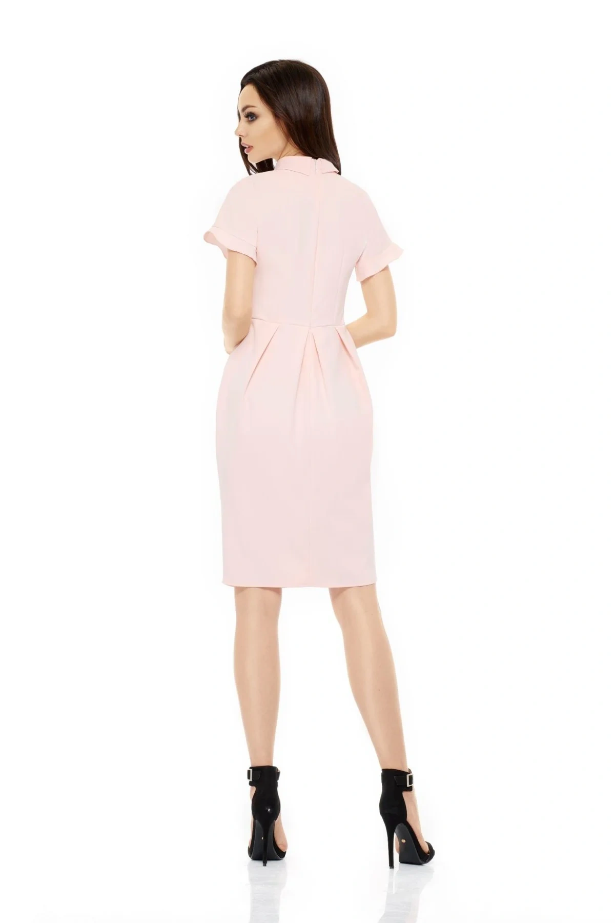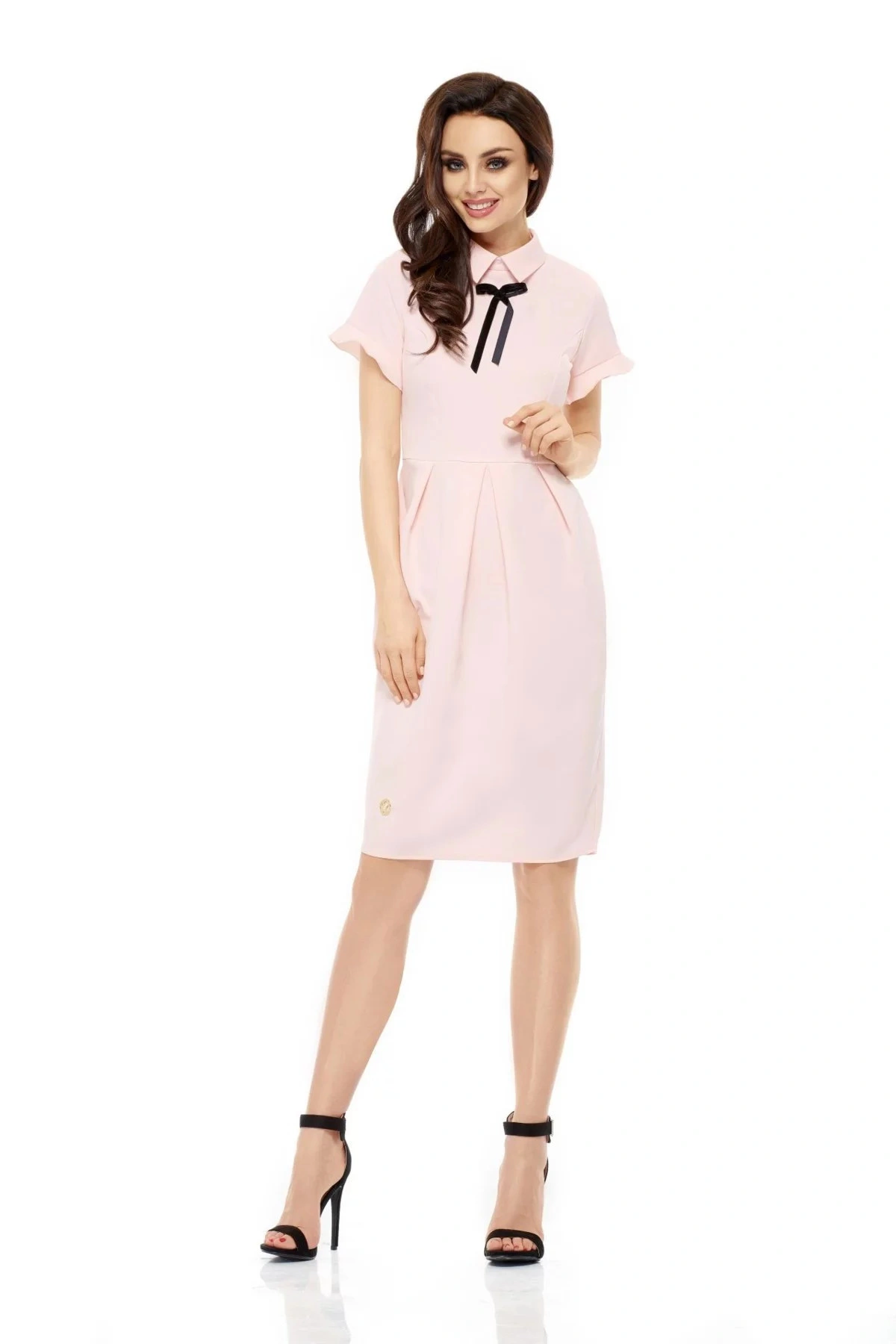 Dámské módní šaty v růžové, černé nebo šedé barvě. Model L234 má místo výstřihu límeček a sametovou černou stužku. Šaty jsou s krátkými rukávy zakončenými volánky a jejich délka je až ke kolenům. Šaty jsou na bocích volnější, aby zakryly případné nedostatky a jsou střiženy tak, aby zdůraznily štíhlý pas. Tyto šaty se hodí pro každou ženu a lze je nosit každý den do práce, na obchodní schůzky, do divadla, na oslavy, na rande apod. Tento model je vyroben v Polsku a zaručuje vysokou kvalitu. Materiál, ze kterého jsou šaty vyrobeny, je příjemný na omak.