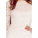 Krajkové společenské šaty v elegantním střihu. Tento model šatů působí velmi romanticky, díky krajkovému provedení a nádhernému nádechu růžové barvy. Šaty mají 3/4 rukáv, který je celý krajkový bez podšívky a kulatý výstřih ke krku. Šaty jsou tvořeny jako dvouvrstvé, první vrstva je z příjemného, neelastického materiálu, druhá vrstva je tvořena krajkou. Šaty mají délku nad kolena. Tyto šaty si můžete vzít na různé společenské události nebo i na párty.