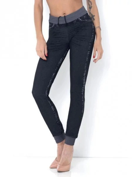 Dámské sportovní bezešvé jeansy se šňůrkou v pase a ve spodní části nohavic zakončeny manžetou. Vyrobeny jsou z jemného elastického materiálu, který se dokonale přizpůsobí tělu. Technologie, kterou byly tyto jeansy vytvořeny je použitelná pouze pro bezešvé výrobky. Speciální design na zadní straně vytváří přirozený efekt zdola nahoru - zvedne a vylepší hýždě. Velmi dobrá pevnost a odolnost proti praní.