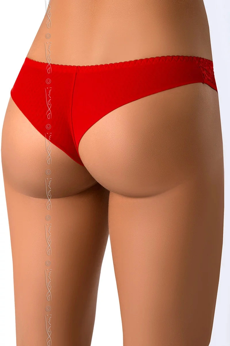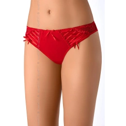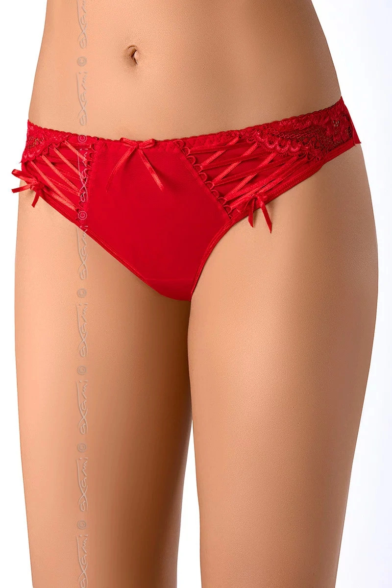 Svůdná červená tanga V-7665 Leila rafinovaně podtrhnou vaši krásu. Originální vzhled dodává šněrování s červenou saténovou stuhou, které je kombinováno s krajkovou vsadkou na bocích.