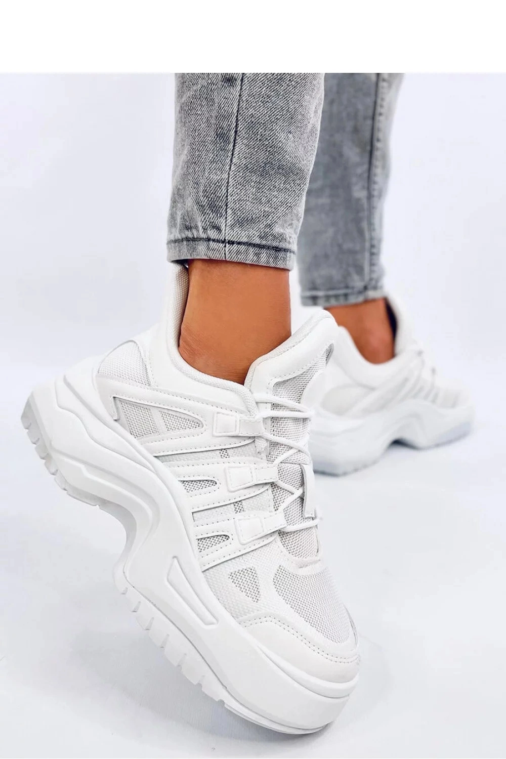 Bílá sportovní obuv - dámské tenisky na 7 cm vysoké platformě. S nimi upoutáte pozornost a dokážete, že se vyznáte v trendech : ) Zaručujeme, že tento výrazný model na pevné podrážce bude hrát vždy první housle! Vnější materiál ? látka + ekologická kůže.
