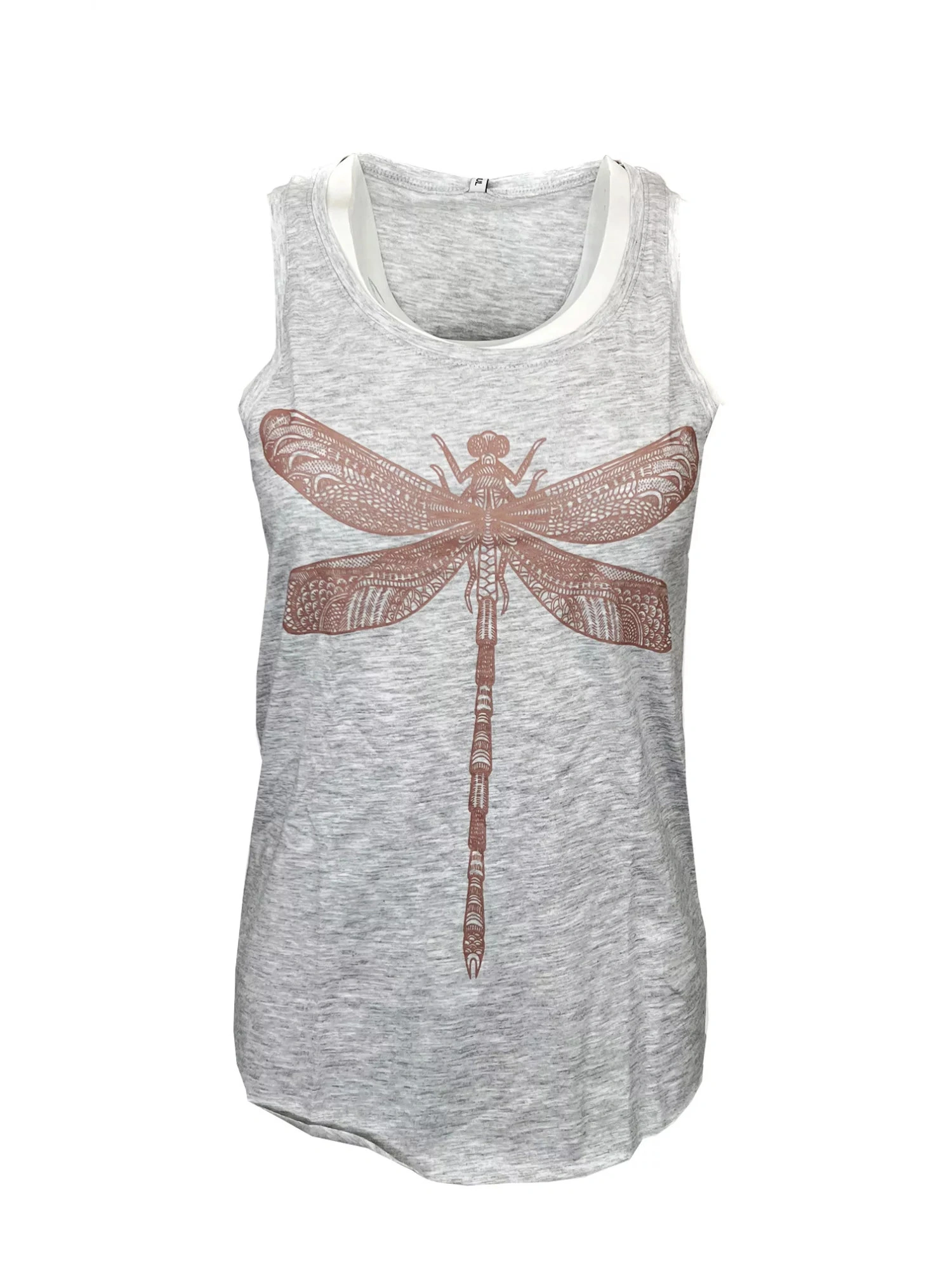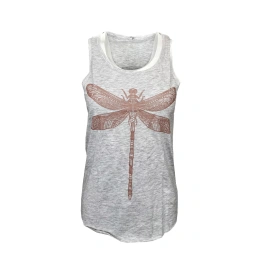 Dámské letní tílko s potiskem velké vážky. Velice příjemný materiál. Spodní část tílka střižená do oblouku.
