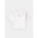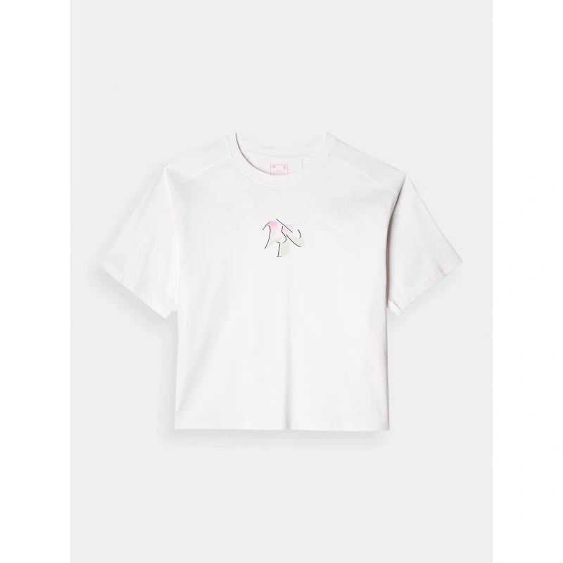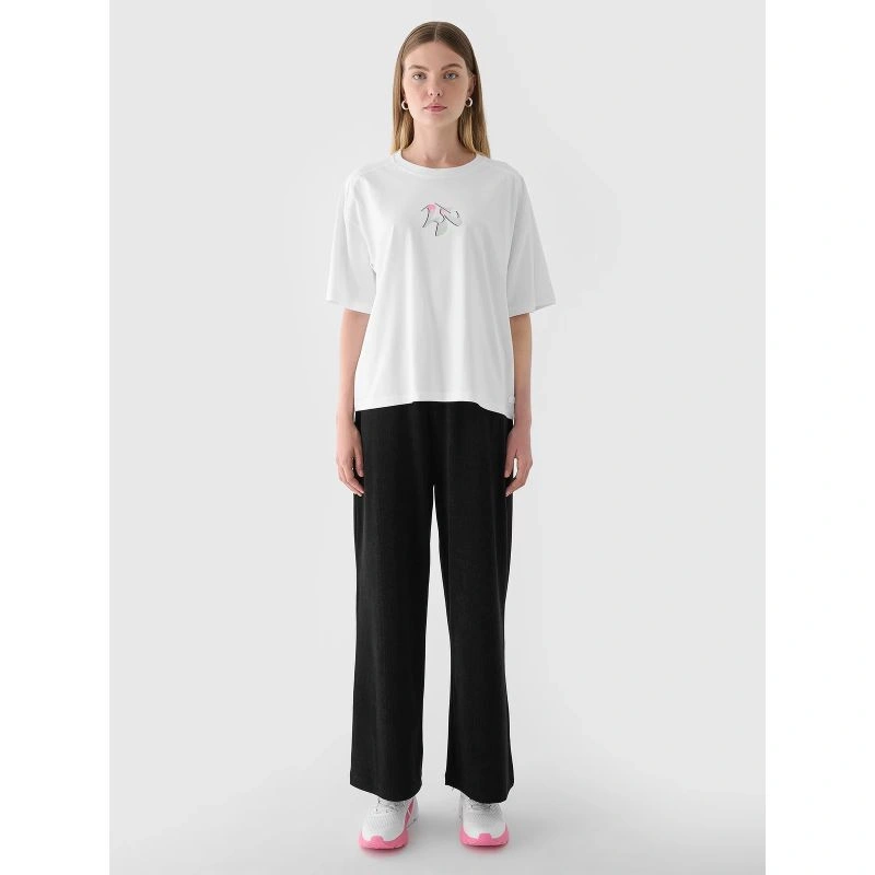 T-shirt z nadrukiem damski idealnie sprawdzi się jako element zarówno casualowych, jak i sportowych stylizacji na co dzień.bPosiada oversizowy krój, który luźno układa się na sylwetce i zapewnia swobodę oraz standardową długość sięgającą do linii bioder. Splot single jersey z jednostronną gładką powierzchnią sprawia, że koszulka jest elastyczna i komfortowa w noszeniu.bKoszulka z nadrukiem damska dzięki gramaturze 200 gsm nie prześwituje i utrzymuje formę. To dobry wybór dla osób, które szukają wytrzymałego i nieco grubszego t-shirtu do użytku przez wiele sezonów.T-shirt 4F damski jest wykonany w 100% z bawełny, dzięki czemu jest miękki, trwały i przyjemny w dotyku. Okrągły dekolt jest zakończony lekkim ribowaniem. Z przodu widoczny nadruk. Obniżone opadające rękawy dodają swobody.