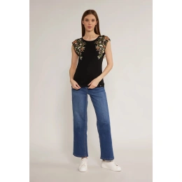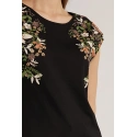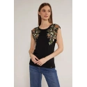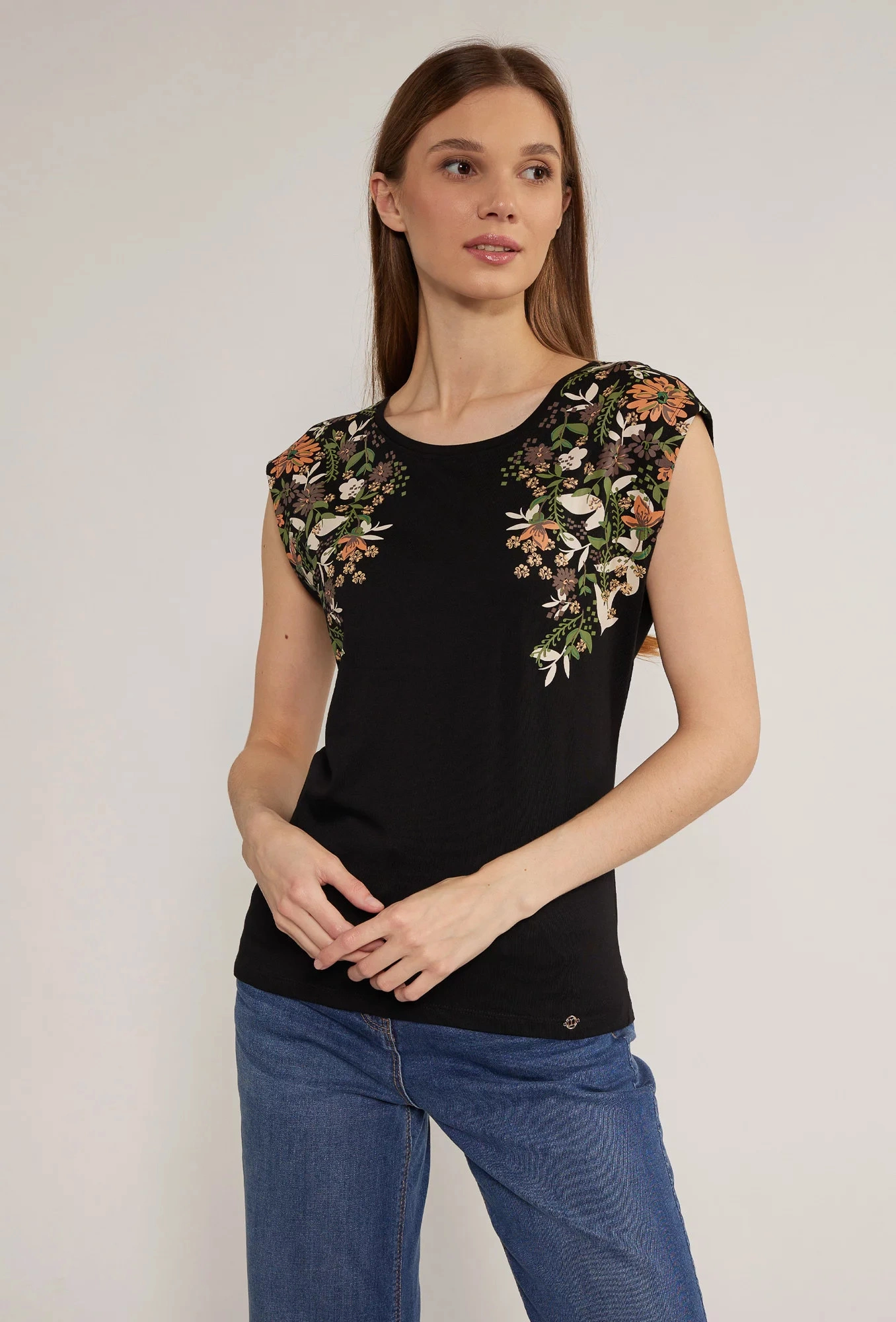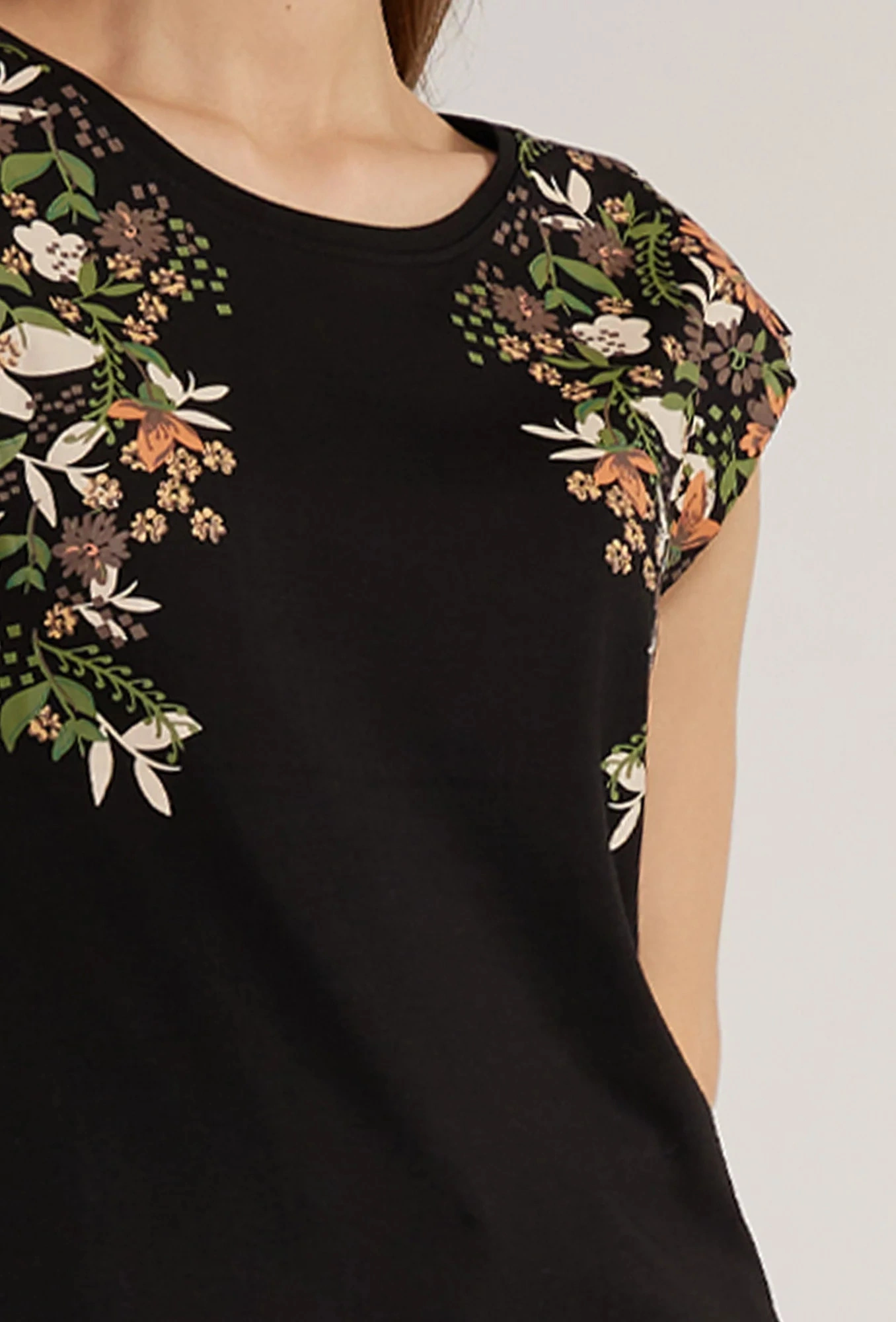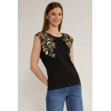 Dámské tričko s květinovým potiskem, bez rukávů a s půlkruhovým výstřihem. Tento model je ideální pro mnoho stylů. Modelka na obrázku je 177 cm vysoká a má velikost 36.