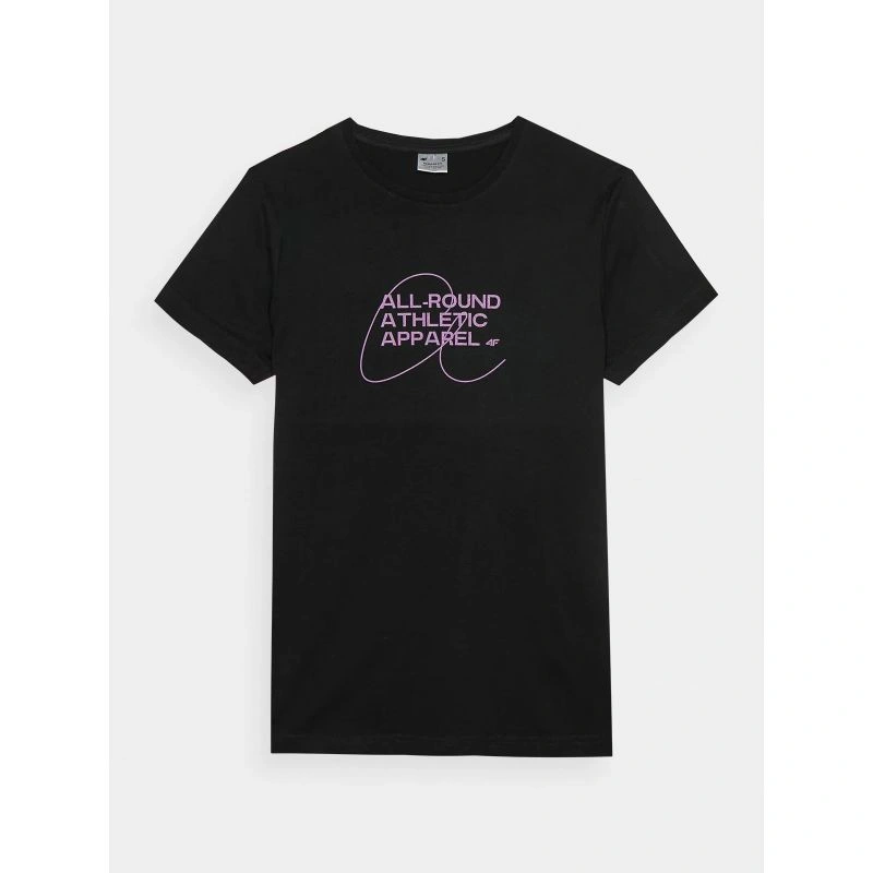 Dámské tričko s potiskem je ideální pro ležérní i sportovní každodenní vzhled. Tričko má přiléhavý střih, který přiléhá k tělu, a standardní délku, která sahá až k bokům. Díky jednostranné vazbě jersey s hladkým povrchem je tričko pružné a pohodlné na nošení. Dámské tričko 4F je vyrobeno ze 100% bavlny, takže je měkké, odolné a příjemné na dotek. Kulatý výstřih je zakončen lehkým žebrovaným lemem. Na přední straně je viditelný nápis "All-Round Athletic Apparel".