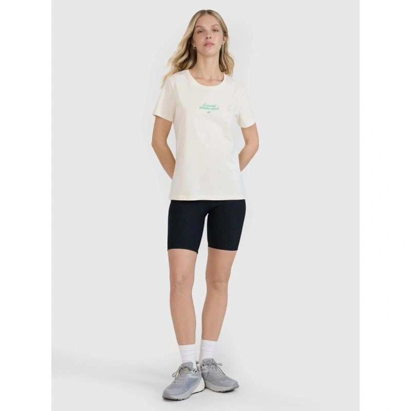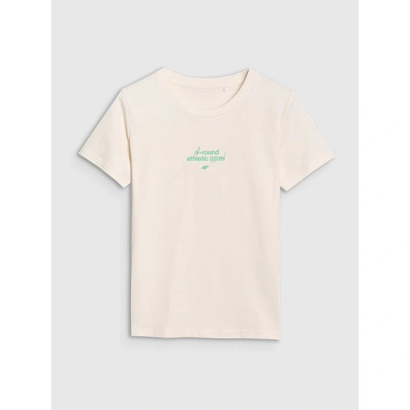 kulatý výstřih s mírným žebrováním zvyšuje odolnost provedení, zatímco nápis "All-round Athletic Apparel 4F" na přední straně dodává tričku sportovní nádech a zdůrazňuje jeho všestranné využití.