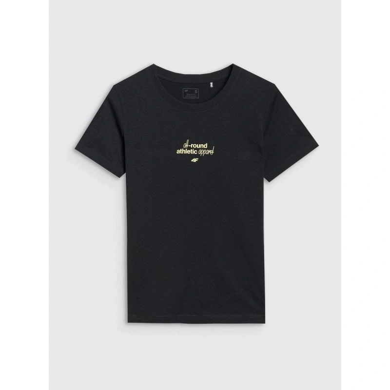 kulatý výstřih s mírným žebrováním zvyšuje odolnost provedení, zatímco nápis "All-round Athletic Apparel 4F" na přední straně dodává tričku sportovní nádech a zdůrazňuje jeho všestranné využití.