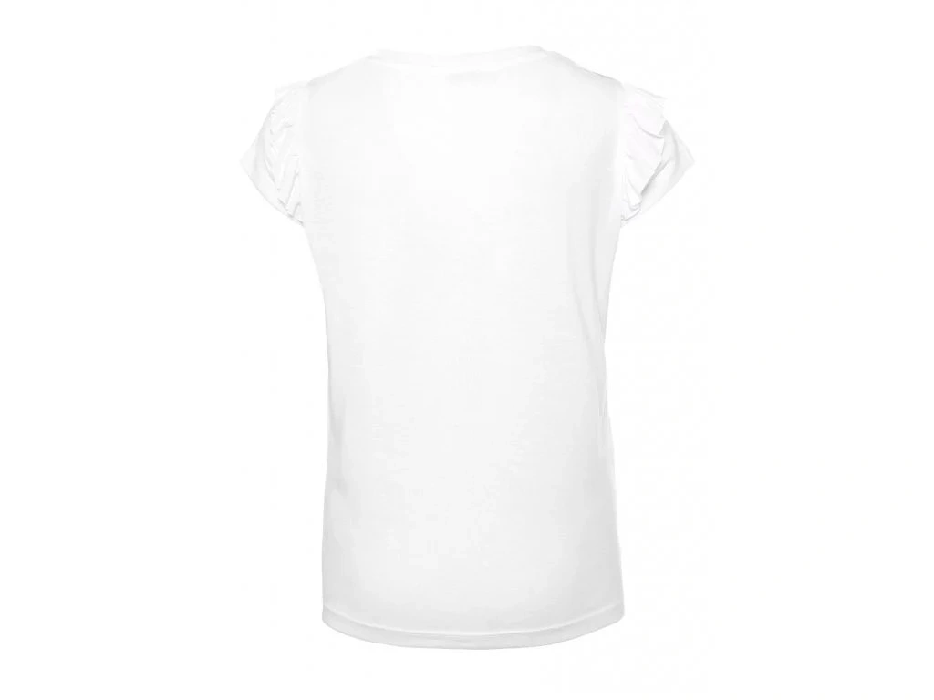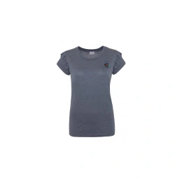- dámské tričko s volánky, které na hrudi zdobí ozdoba s motivem včely vyrobené z korálků a flitrů,