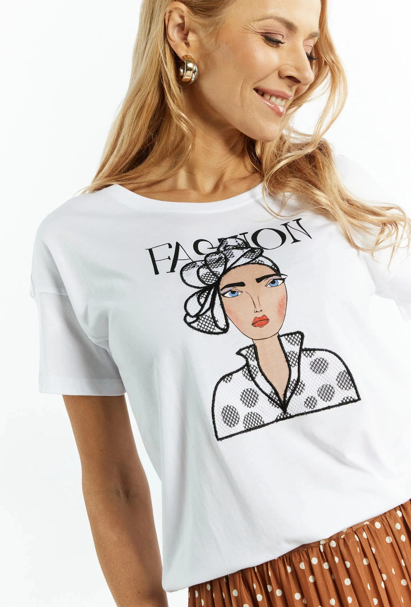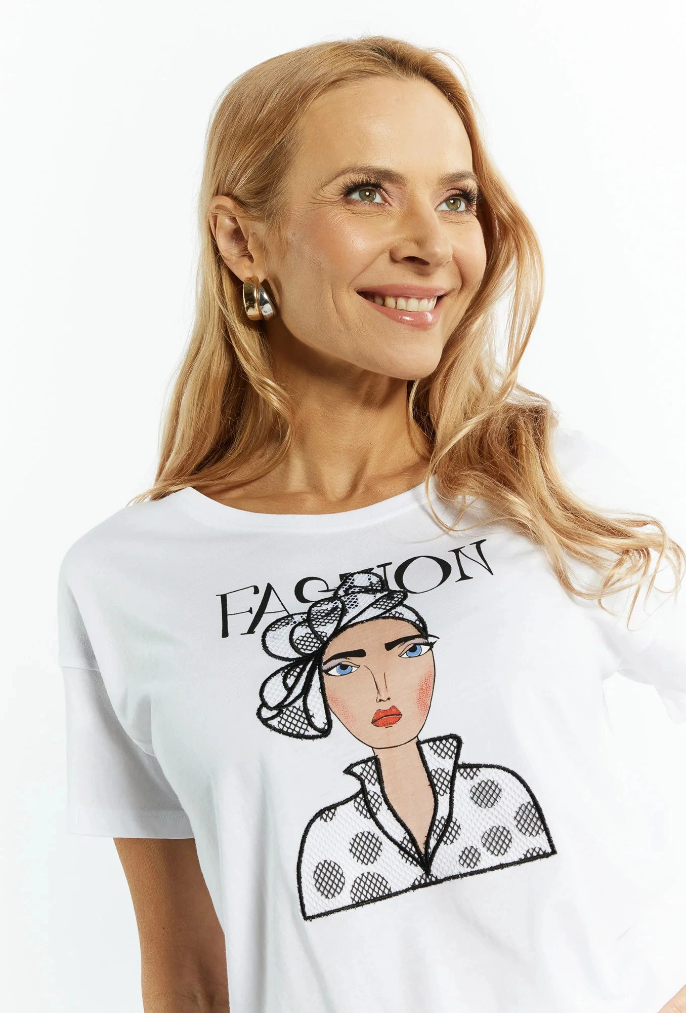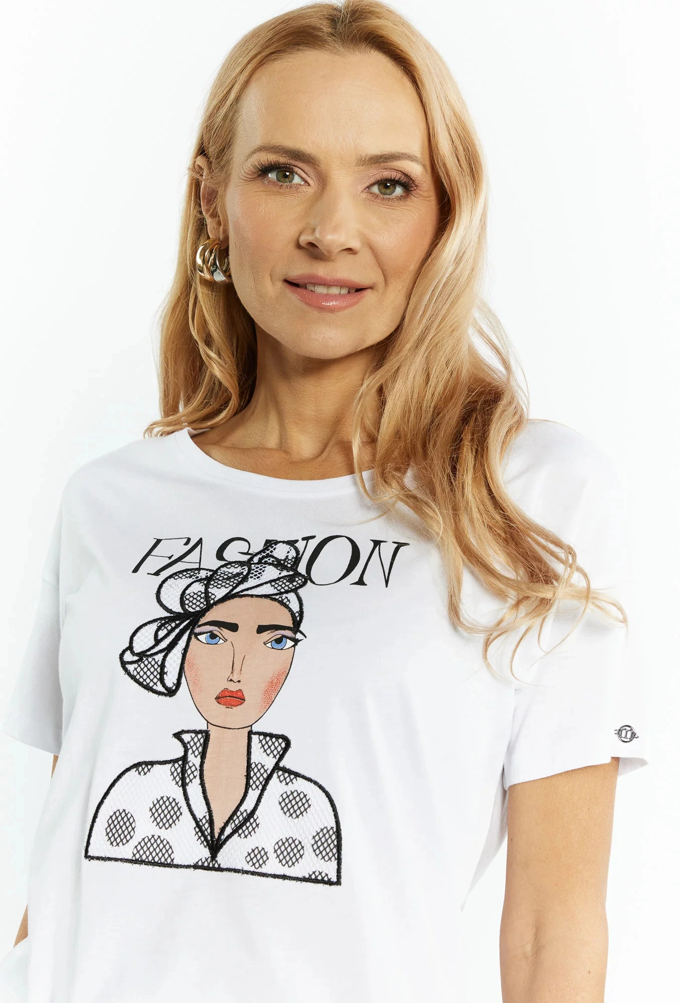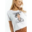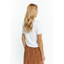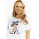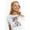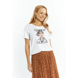 Dámské tričko ležérního střihu s potiskem na předním panelu. Tričko s krátkými rukávy a půlkruhovým výstřihem. Tričko má navíc ve spodní části žebrování se zavazováním. Tento model je ideální pro každodenní styling. Modelka na fotografii měří 177 cm a nosí velikost S.