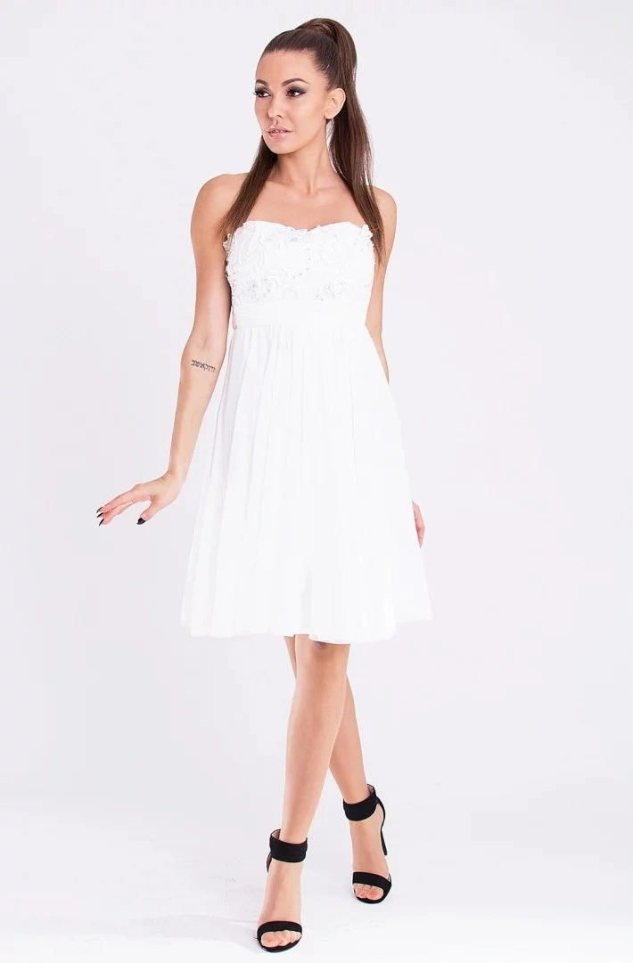 Dámské šaty zdobené korálky s rozšířenou sukní. V zadní partii pružné žabičkování, které umožní šatům se přizpůsobit postavě.