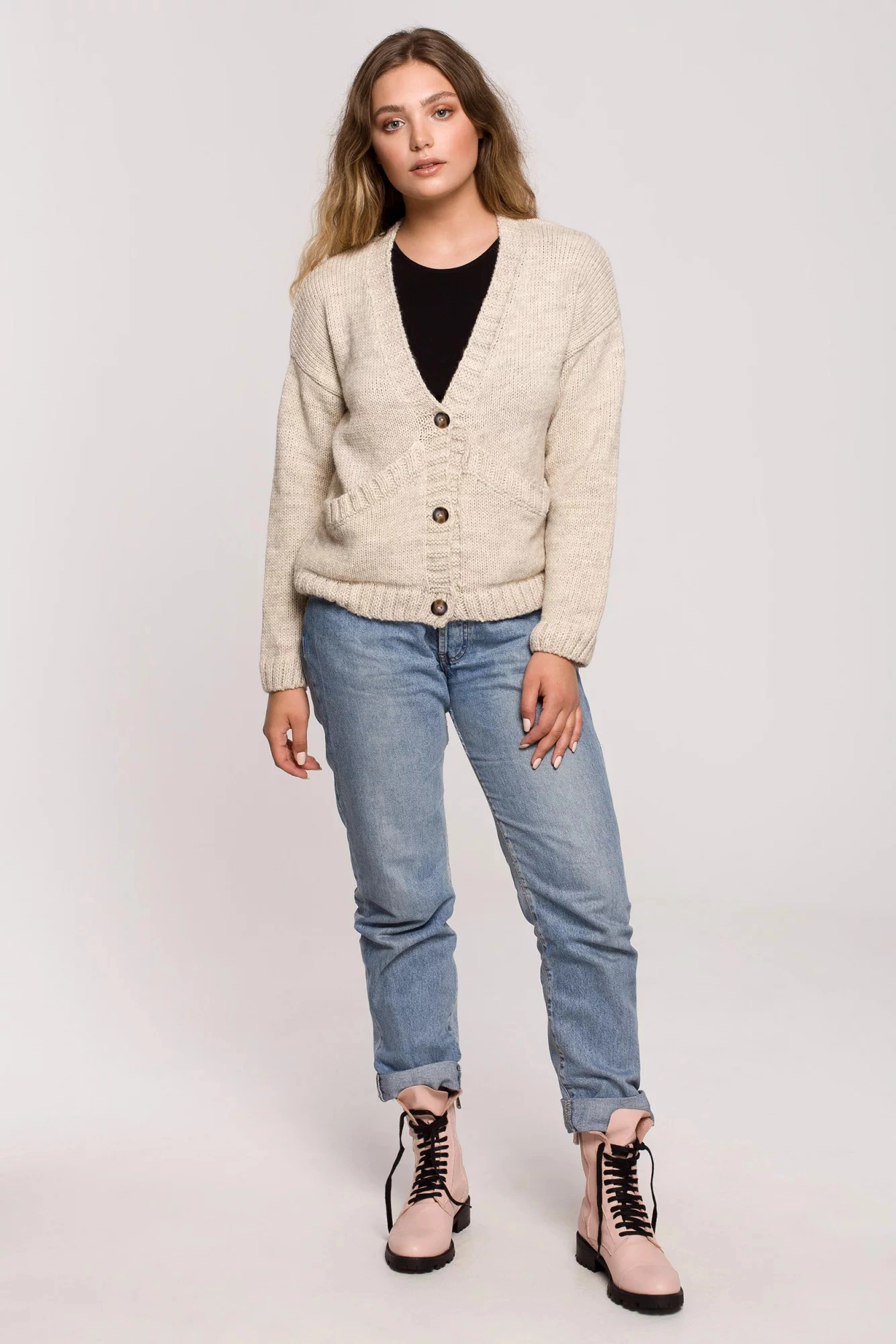 S tímto zkráceným svetrem z hrubé pleteniny s velkými kapsami, zapínáním na knoflíky a lichotivým výstřihem ve tvaru V vytvoříte řadu dobrých outfitů.