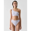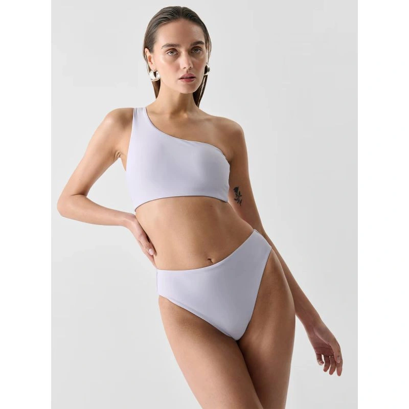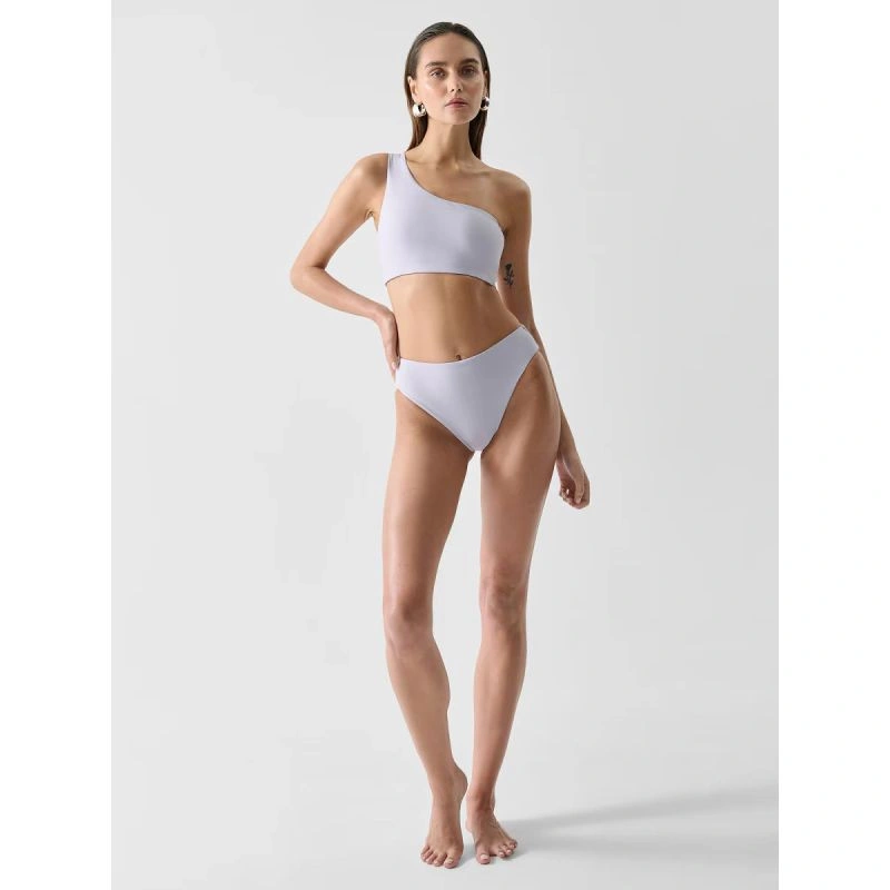 Tato podprsenka je vyrobena z měkké a pružné syntetické tkaniny, má jedinečný střih na jedno rameno a odnímatelné vycpávky pro individuální podporu. Absence zapínání jí dodává elegantní estetiku, zatímco hladká podšívka zajišťuje pohodlné nošení.