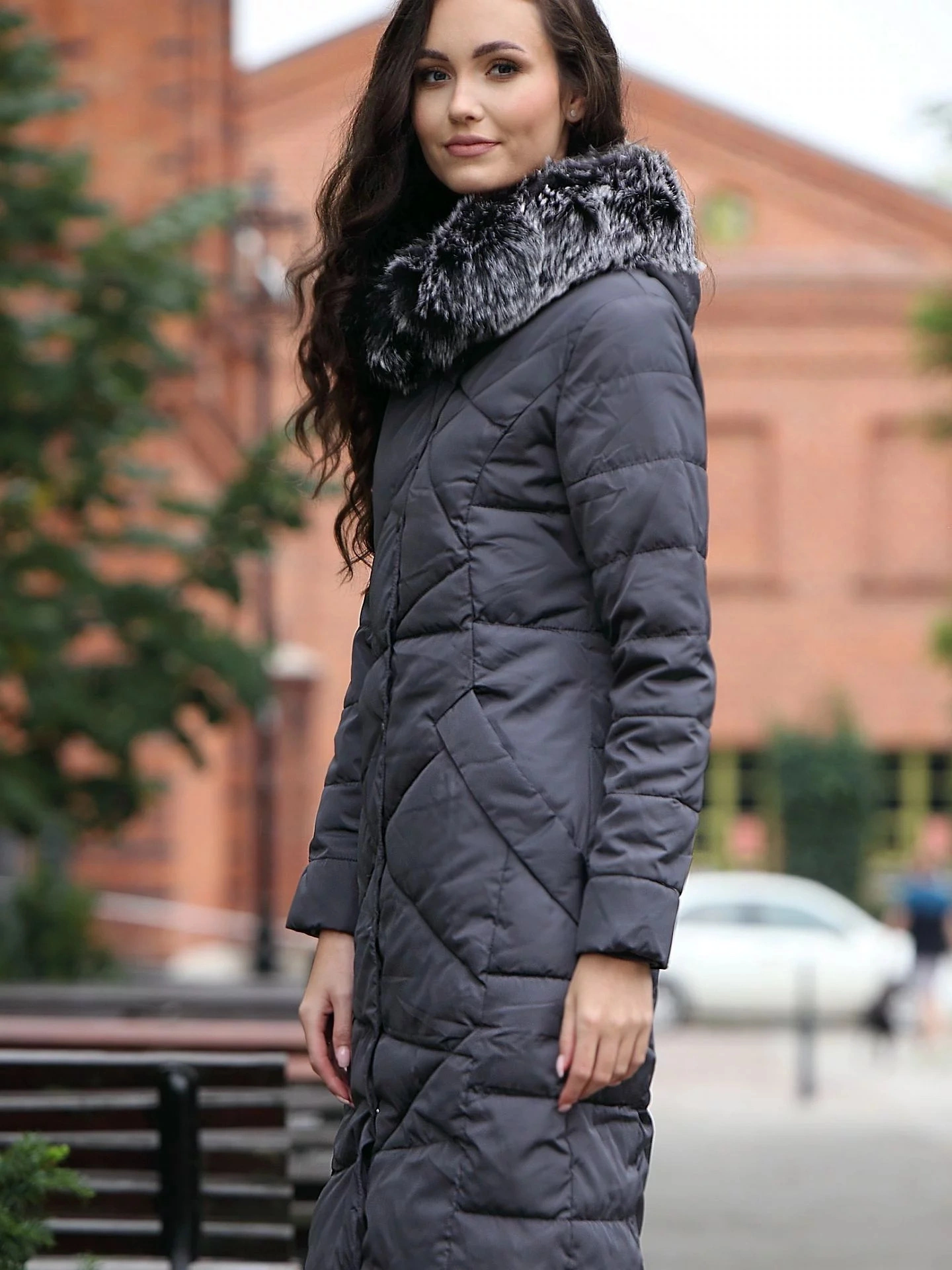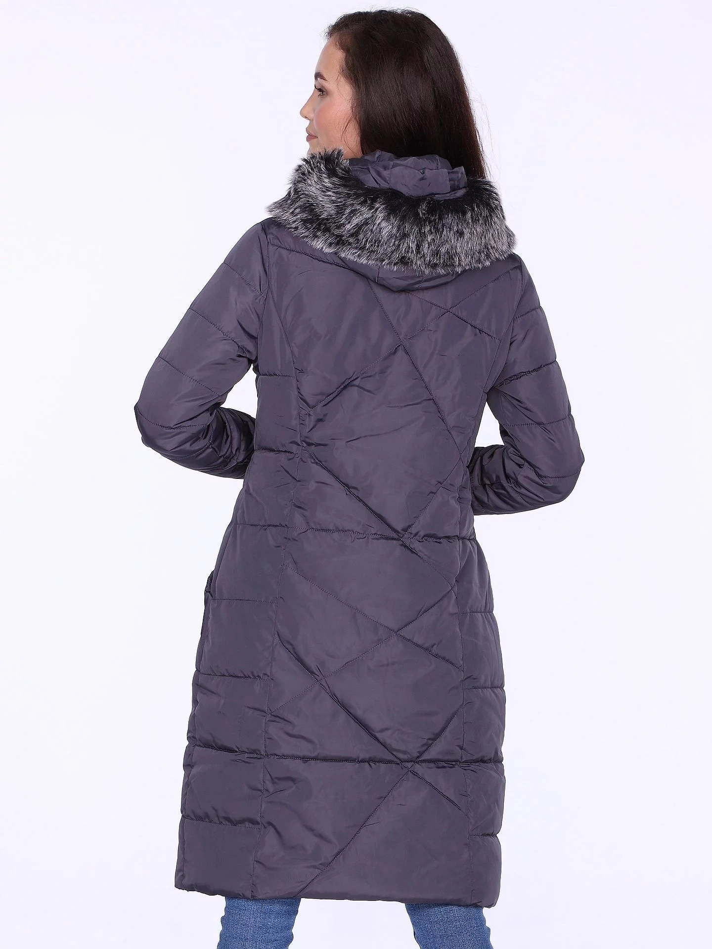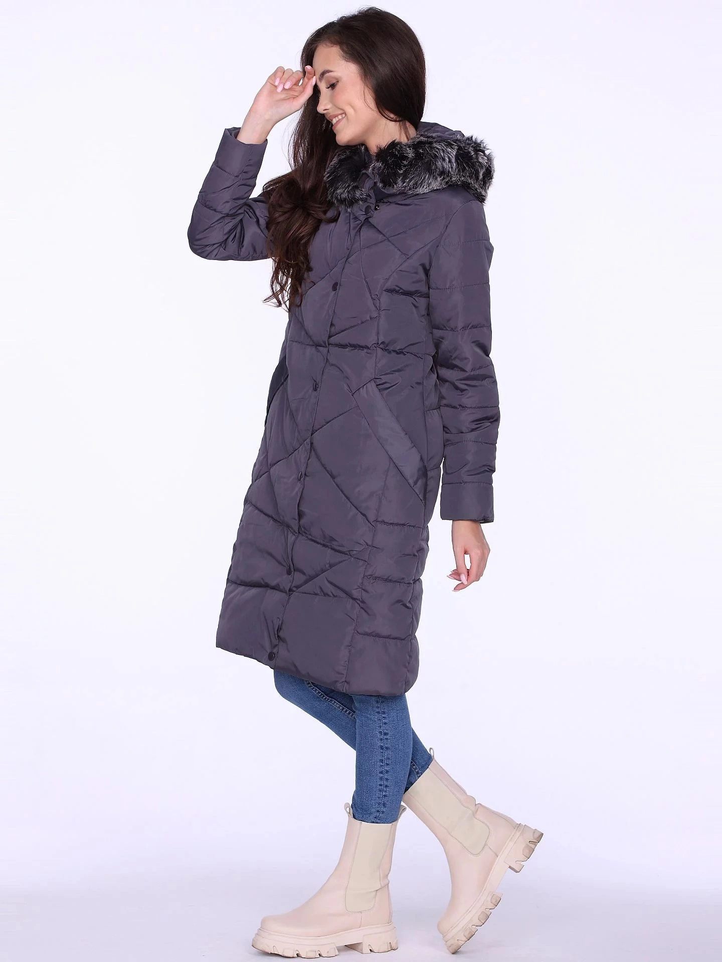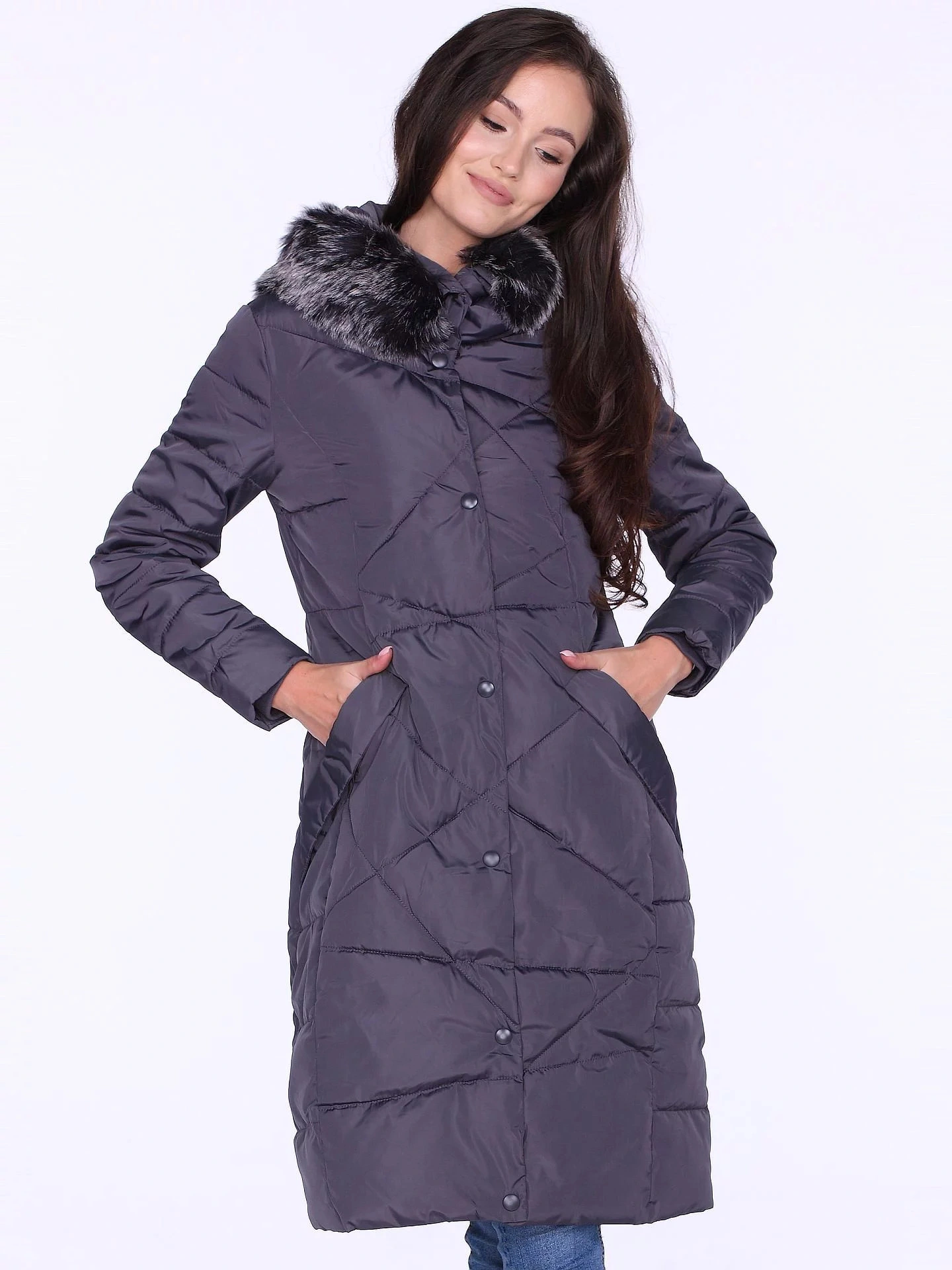 Zimní dlouhý dámský kabát s neobvyklým prošíváním je velmi ženský návrh v klasické konvenci. Nerovnoměrně uspořádané prošívání působí moderně a dokonale ladí s klasickým odstínem šedé. Kabát poskytuje vynikající tepelnou izolaci během chladných a větrných dnů.