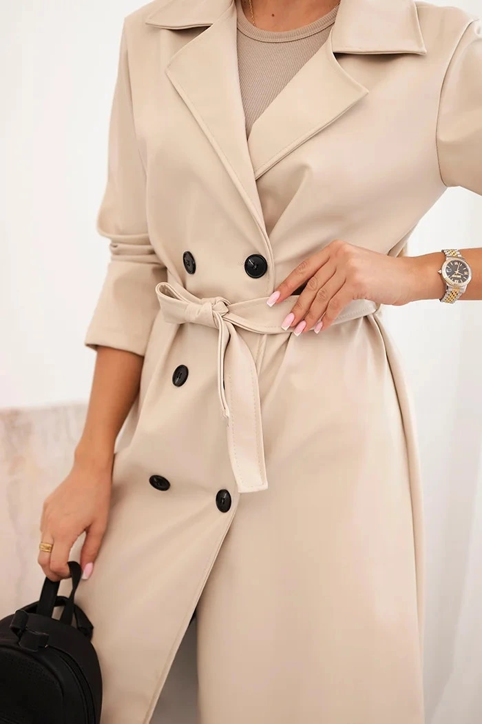 Elegantní dámský kabát s klasickým, prodlouženým střihem je skvělým návrhem na podzimní a zimní sezónu pro ženy, které ocení styl a pohodlí. Model je vybaven širokým límcem, praktickými kapsami a páskem v pase, který krásně zvýrazňuje siluetu. Délka nad kolena a dvojité zapínání na knoflíky dodávají kabátu elegantní, nadčasový charakter.