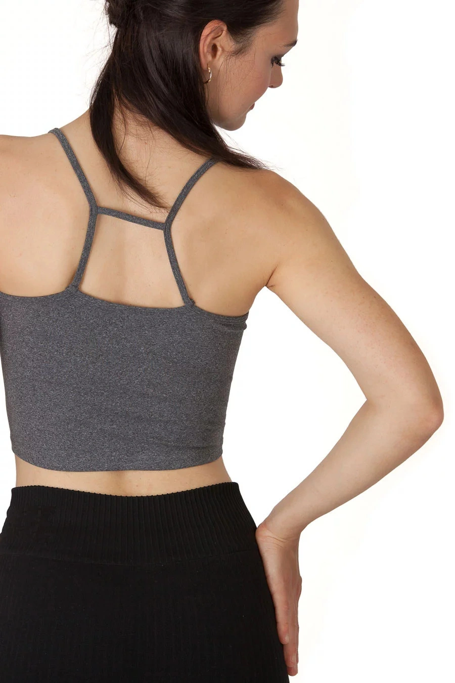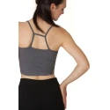 Dámský krátký top na špagetové ramínka, vzadu ramínka rafinovaně spojené. Na boku topu našité logo.