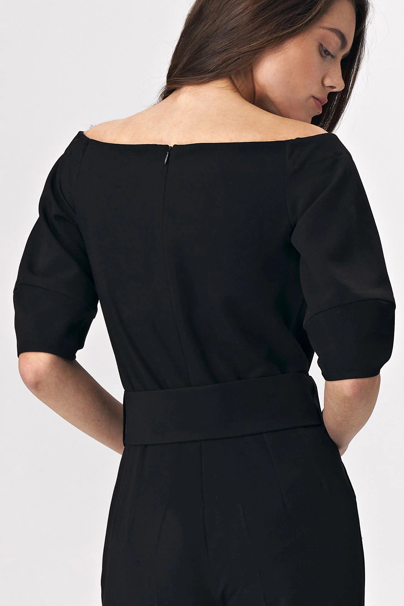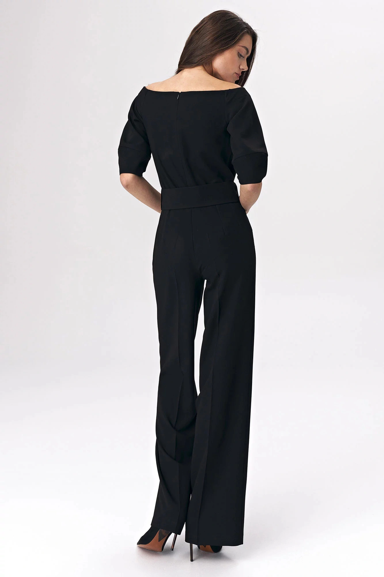 Kalhotový oblek pro zvláštní příležitosti s rukávy po lokty, obálkovým vrškem, záševky a kapsami. Ši