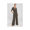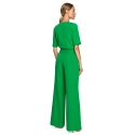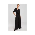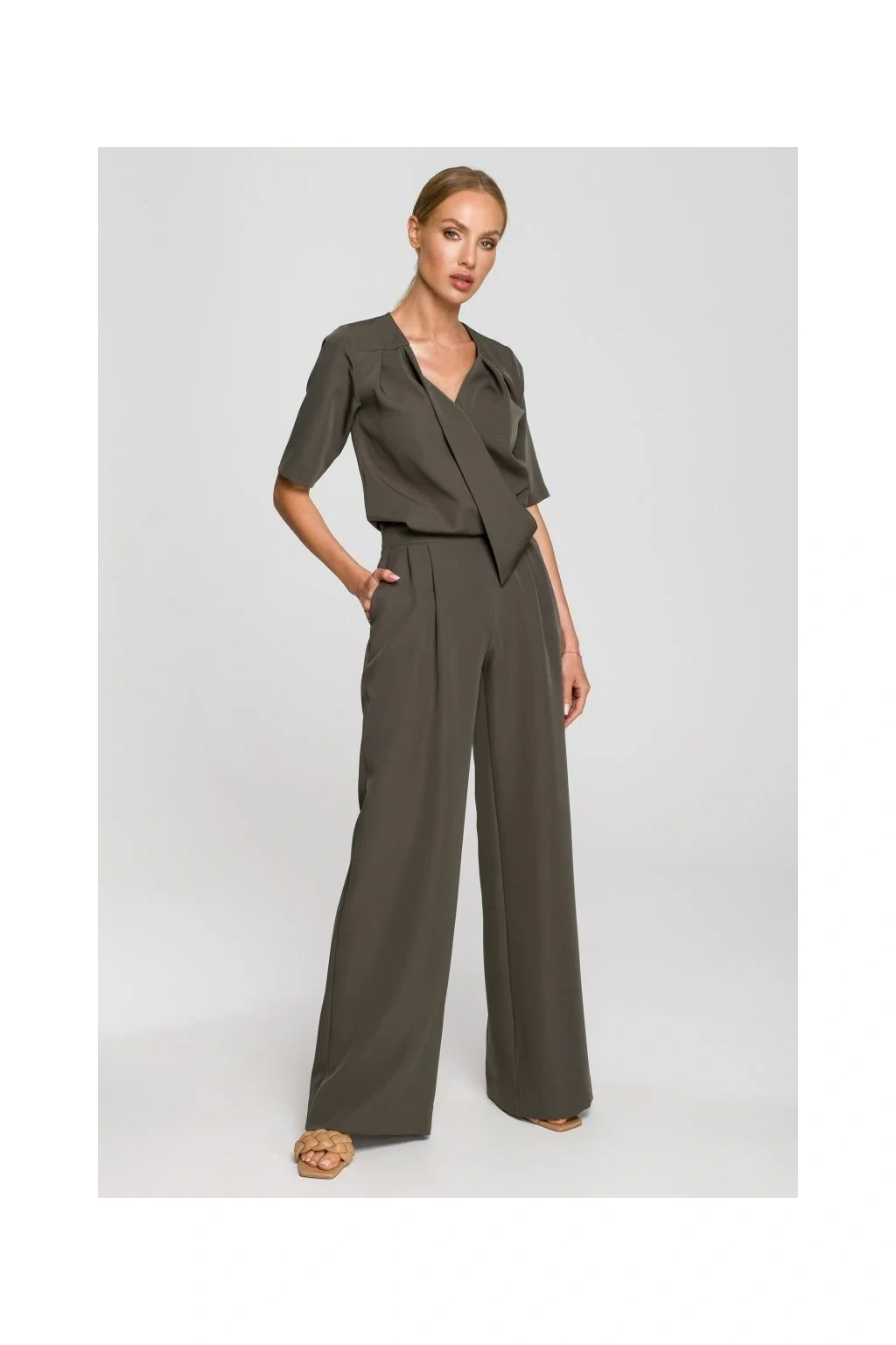 Kalhotový oblek pro zvláštní příležitosti s rukávy po lokty, obálkovým vrškem, záševky a kapsami. Široká nohavice. Zapínání na krytý zip.