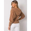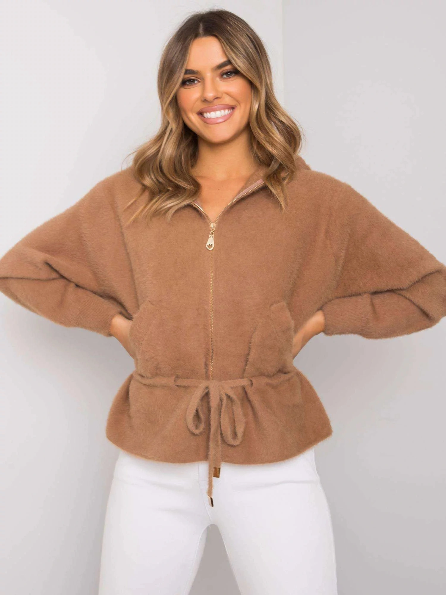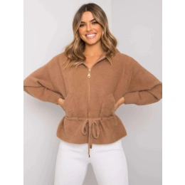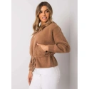 Tmavě béžová krátká bunda z alpaky s kapucí.