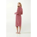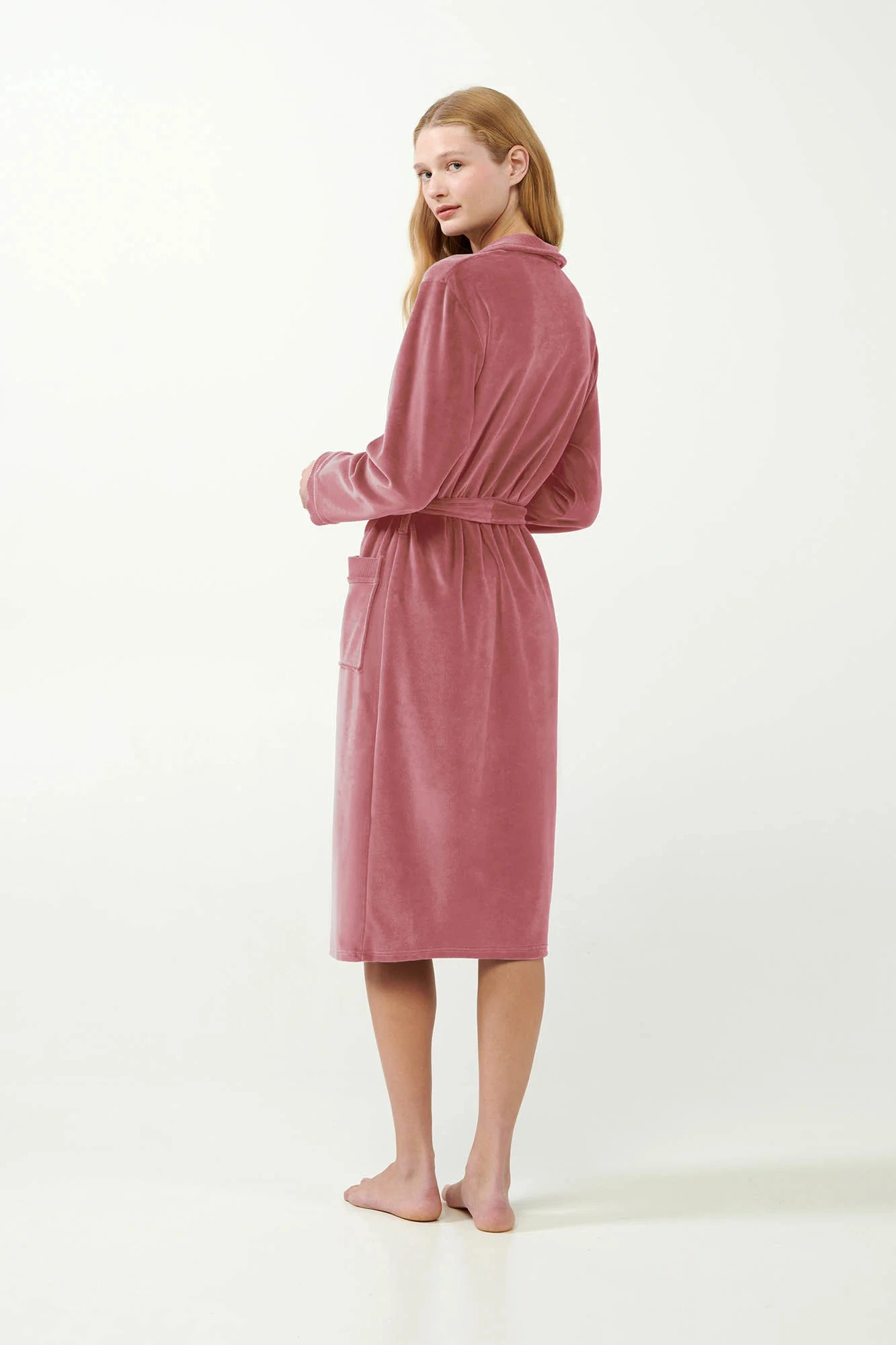 Dopřejte si luxusní pohodlí s tímto dlouhým dámským županem, který je vyroben z měkkého sametu bohatého na bavlnu. Župan má překřížený design s odpovídajícím páskem pro nastavitelné přizpůsobení spolu s praktickými kapsami pro větší pohodlí. Žebrovaný v klopě lem dodává županu nádech sofistikovanosti, takže je ideální pro útulné večery doma. Tento župan kombinuje eleganci s hřejivostí, což vám zajistí styl a pohodlí.