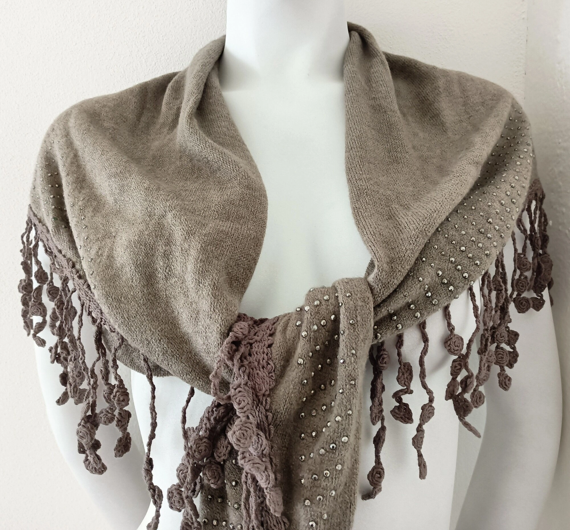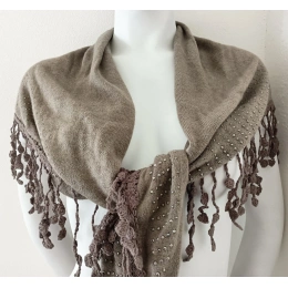 Dámský trojhranný šátek posetý kamínky. Na bocích třásně. Materiálové složení: 100% Acryl