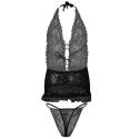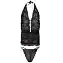 Krajková košilka s otevřenými zády. Intenzivní černá, sexy. Ideální pro sezónu jaro-léto, košíčky ve stylu braletky, prodloužené, zavazování za krkem. Krajka je měkká a pružná, střih je přizpůsobený tělu. Měkká guma na spodním lemu udržuje střih pěkně na těle. Tanga jsou součástí balení. Složení: 100% polyester.