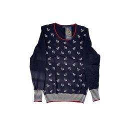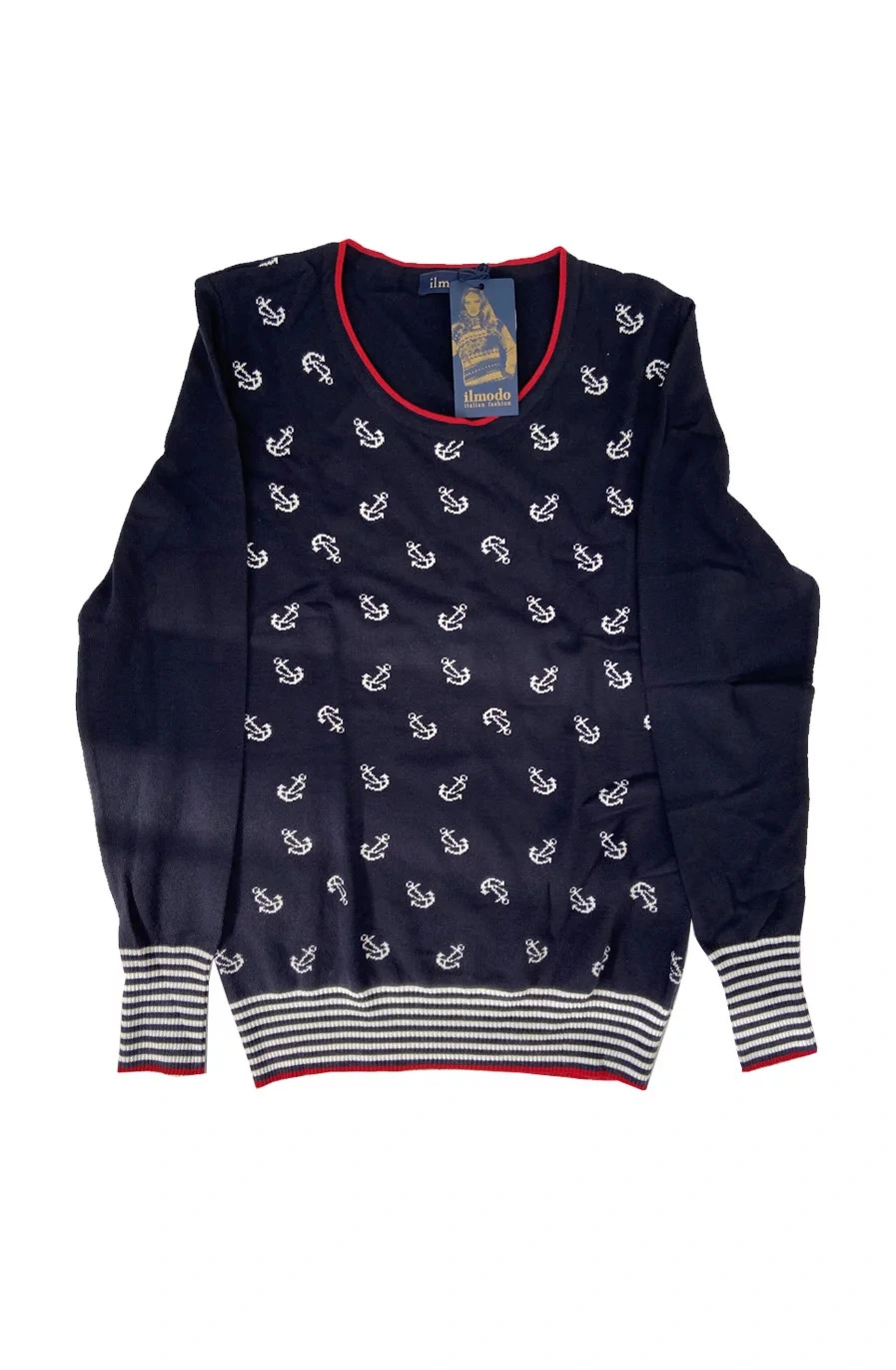 Dámský svetr 432H- 987E - Ilmodo- je elegantní svetřík s námořním designem a kotvičkami. Má kulatý výstřih, který má červený lem a taktéž jsou zakončeny rukávy, které mají navíc modrobílý proužek, který je rovněž i v pase.
