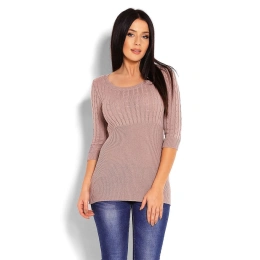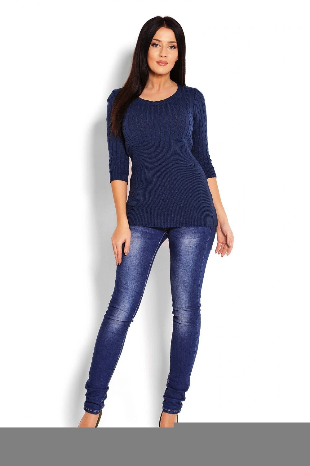 Krásně obepíná postavu pod prsy. Tento svetr má tříčtvrteční rukávy a kulatý výstřih.