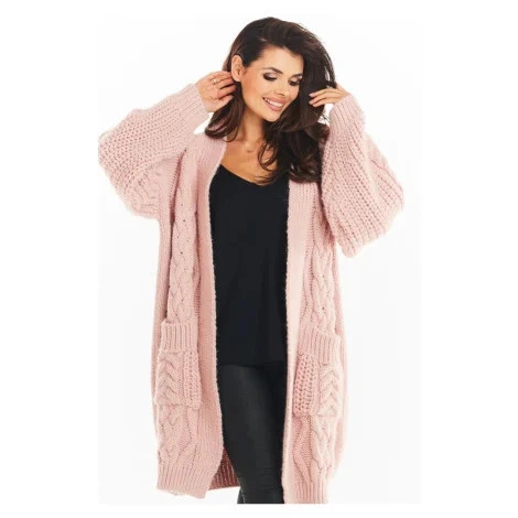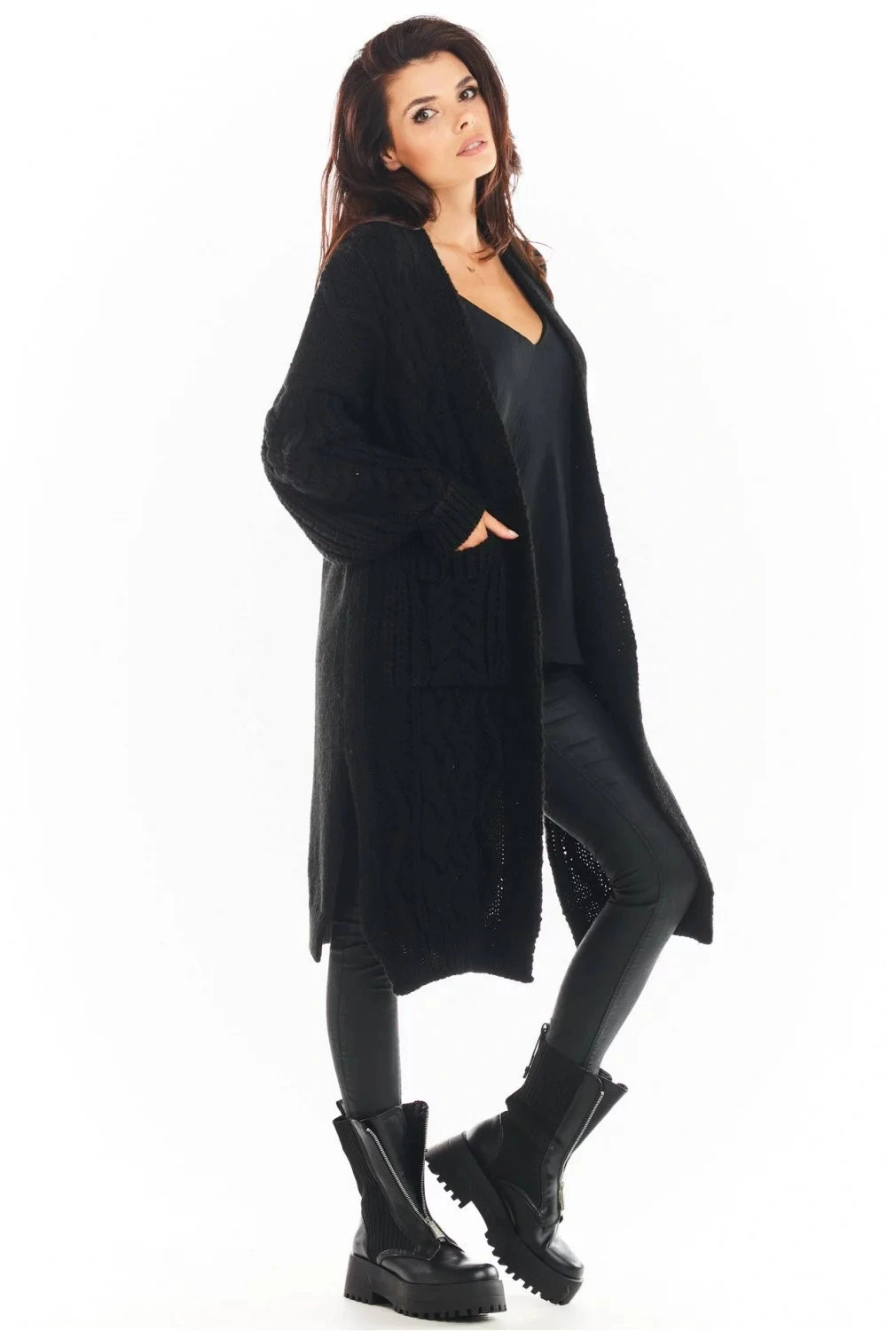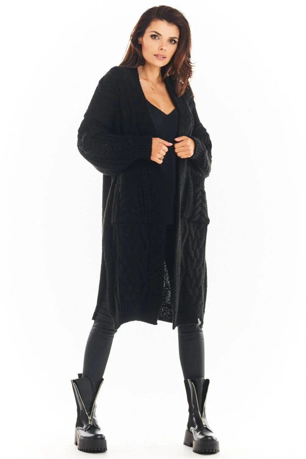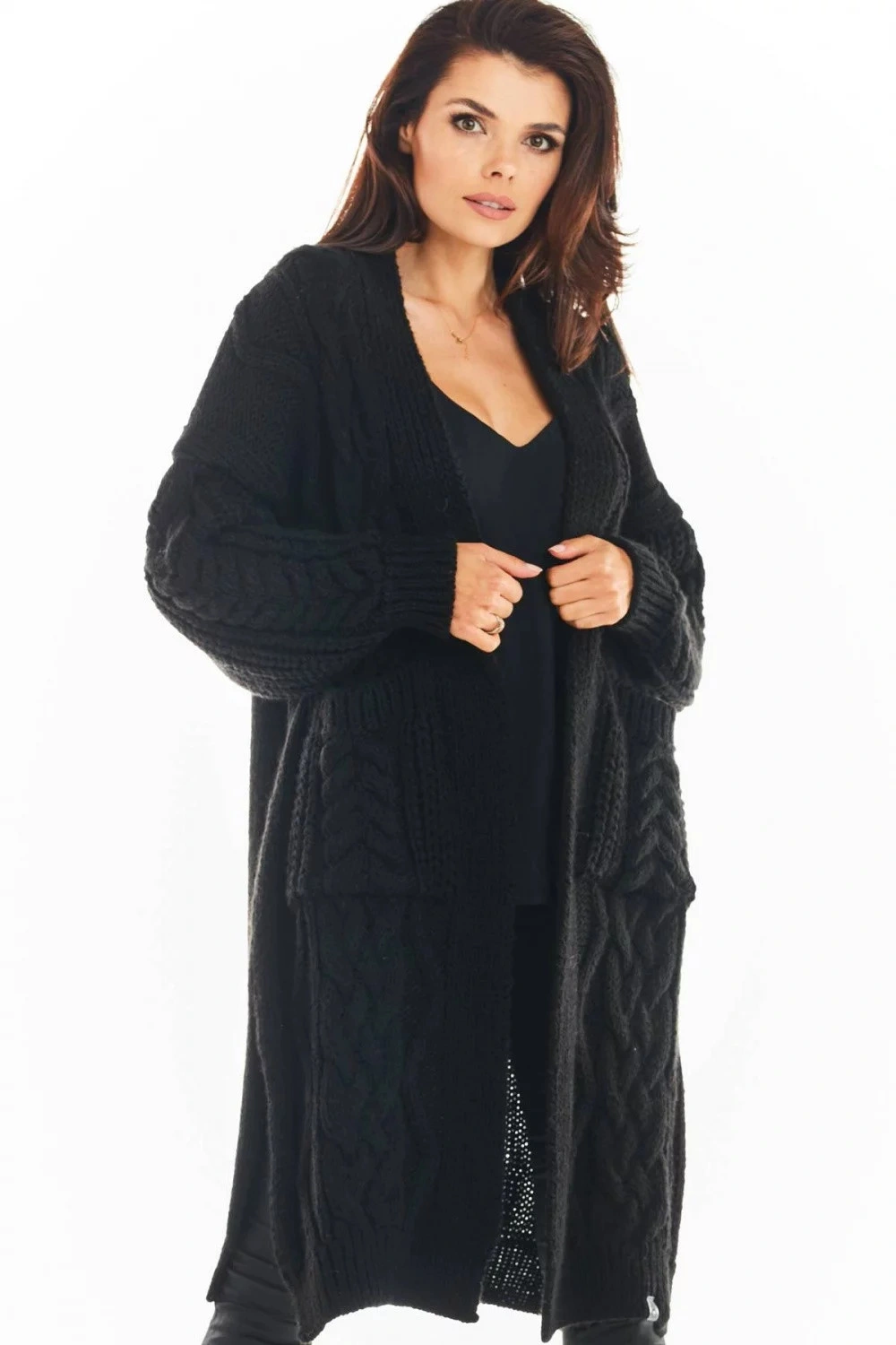 Dlouhý, tlustý svetr se dvěma kapsami vpředu a širokými Rukávy. Přední část svetru je zdobena copánky a rukávy mají silnější vazbu.Vhodné pro mnoho sportovních a elegantních stylizací.Výrobek je navržen a ušit v Polsku.